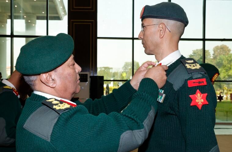 काठमाडौँ । मन्त्रिपरिषद्को मङ्सिर ५ गतेको निर्णयअनुसार उपरथीमा विशेष बढुवा भएका सहायक रथी कृष्णप्रसाद भण्डारीलाई प्रधानसेनापति अशोकराज सिग्देलले मंगलबार जङ्गी अड्डामा आयोजित एक कार्यक्रममा उपरथी दर्जाको दर्ज्यानी चिह्न प्रदान गरेका छन् ।