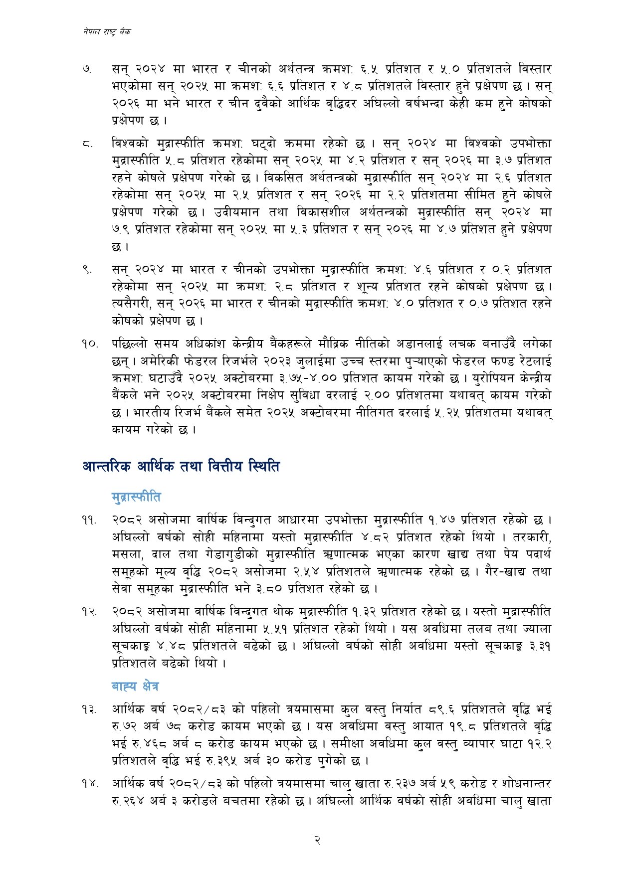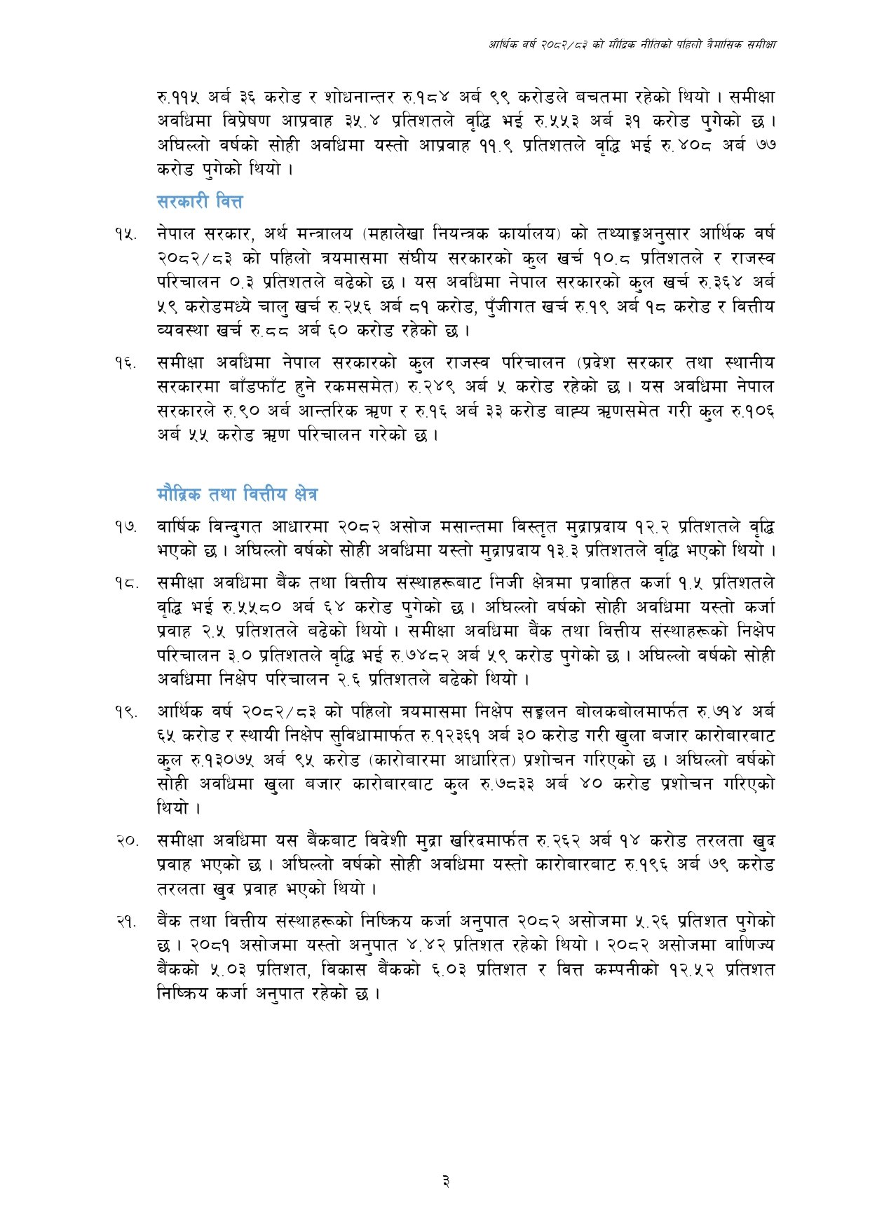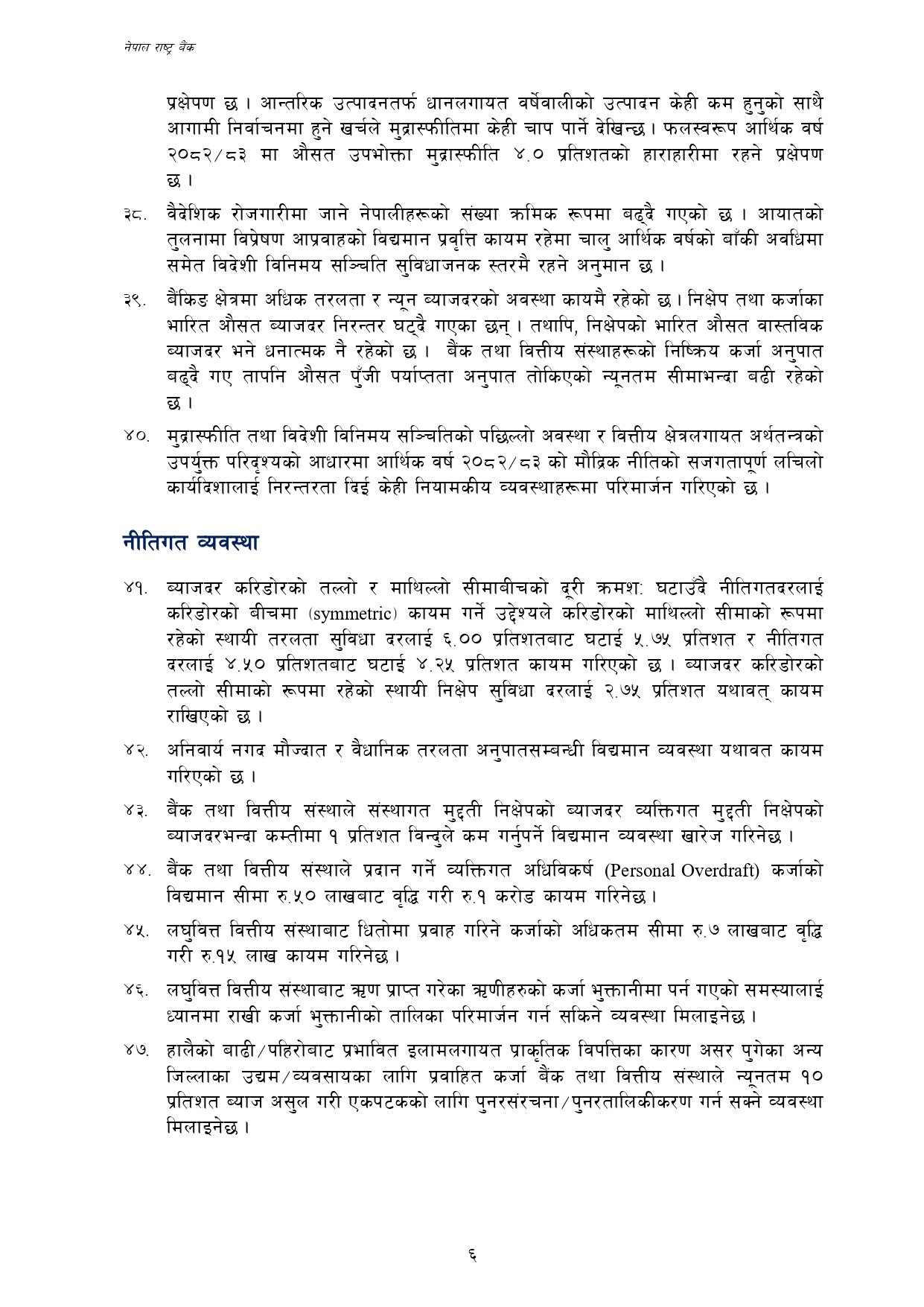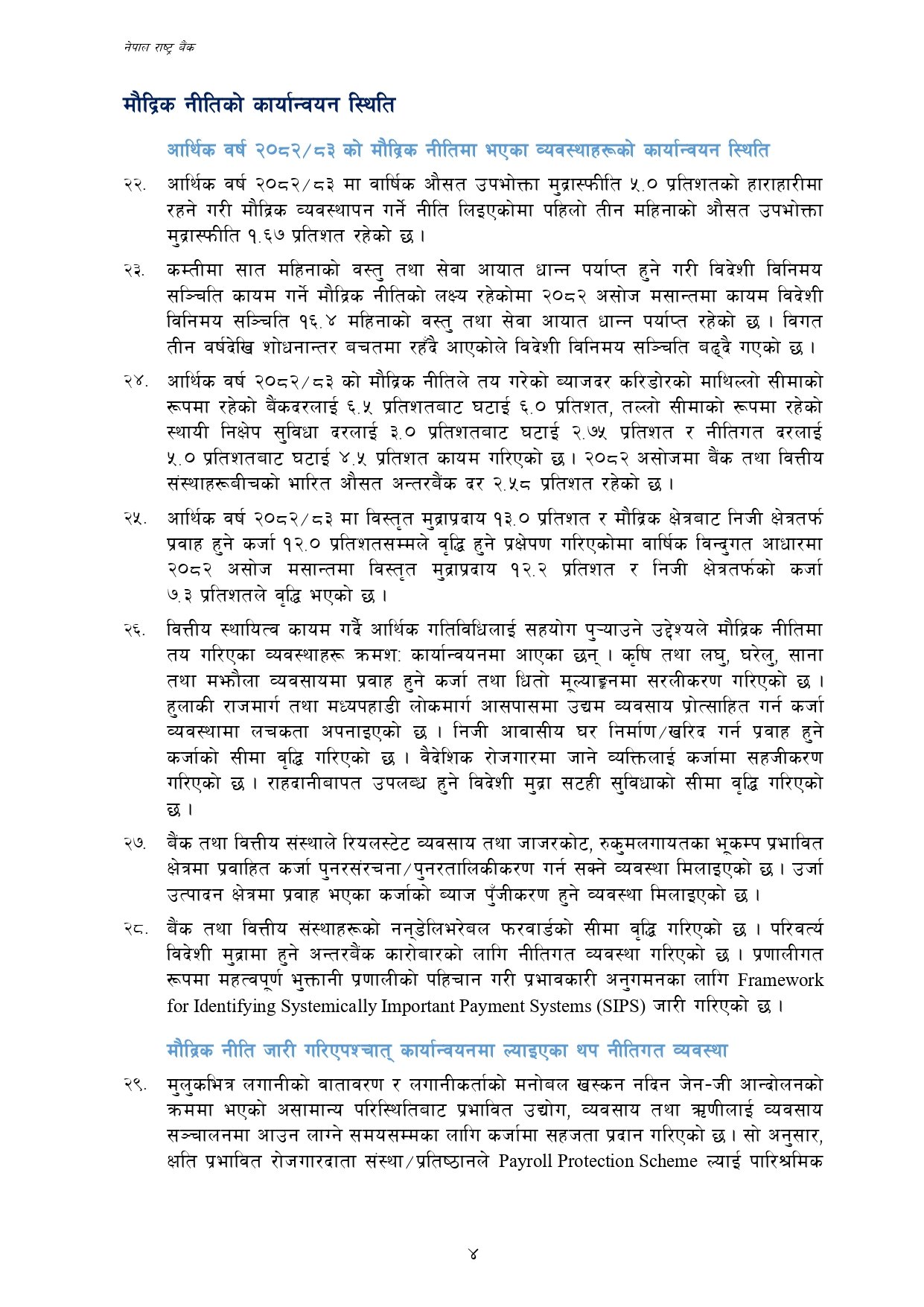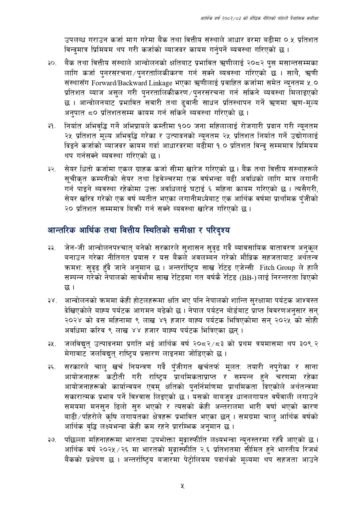 यस्तै लघुवित्त वित्तीय संस्थाबाट धितोमा प्रवाह गरिने कर्जाको अधिकतम सीमा पनि बढाइएको छ । हाल ७ लाख रुपैयाँसम्म रहेको यस्तो सीमा वृद्धि गरी १५ लाख रुपैयाँ पुर्याउने भएको हो । त्यस्तै, लघुवित्तबाट ऋण प्राप्त गरेका ऋणीहरुको कर्जा भुक्तानीमा पर्न गएको समस्यालाई ध्यानमा राखी कर्जा भुक्तानीको तालिका परिमार्जन गर्न सकिने व्यवस्था गर्ने घोषणा मौद्रिक नीति समीक्षाले गरेको छ ।