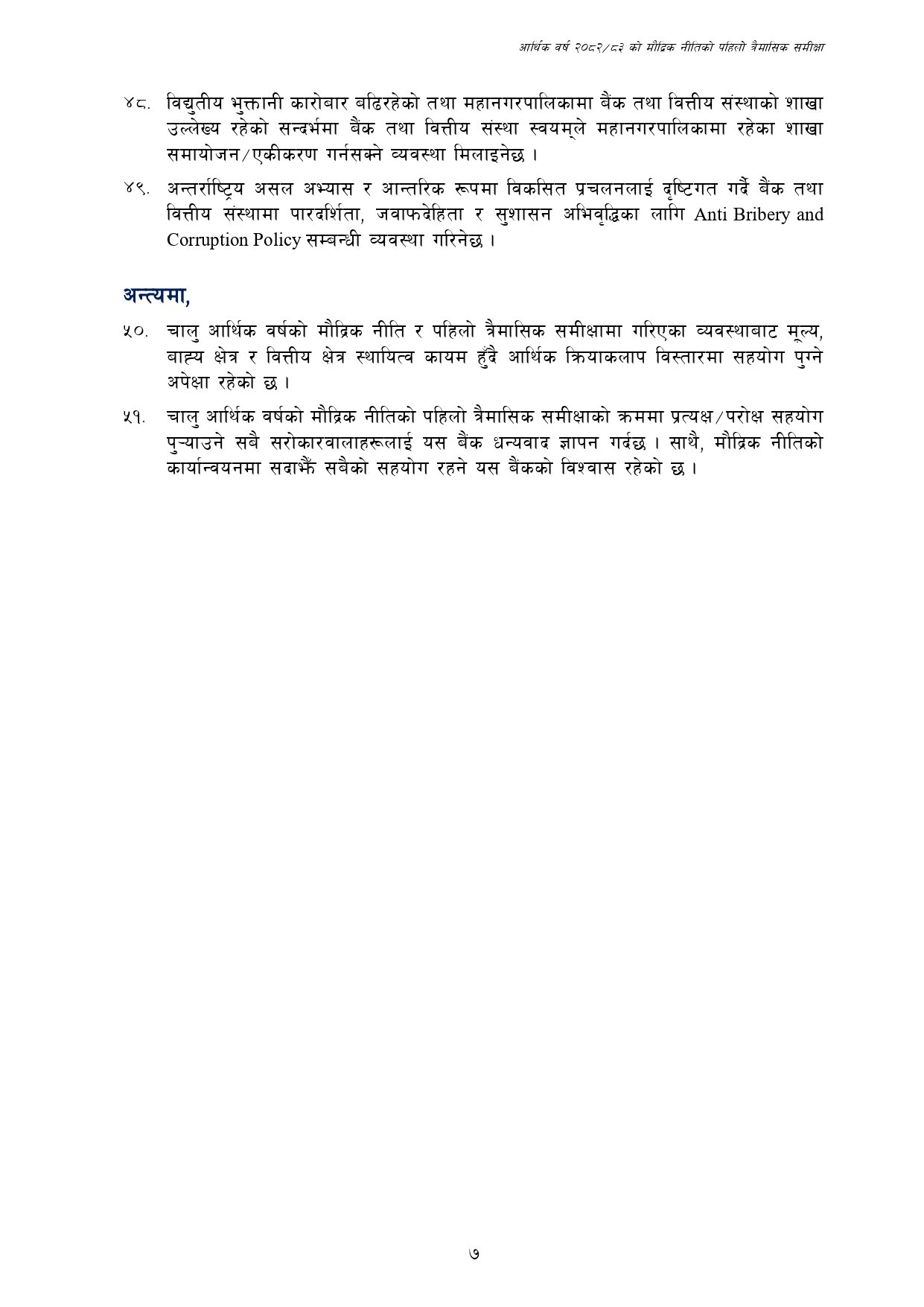 त्यसैगरी बैंक तथा वित्तीय संस्थाले देशभरका महानगरपालिकाभित्र रहेका बैंक शाखाहरु एकीकरण वा समायोजन गर्न सक्ने भएका छन् । केन्द्रीय बैंकले मौद्रिक नीतिको प्रथम त्रैमासिक समीक्षा सार्वजनिक गर्दै यस्तो व्यवस्था गरेको हो ।