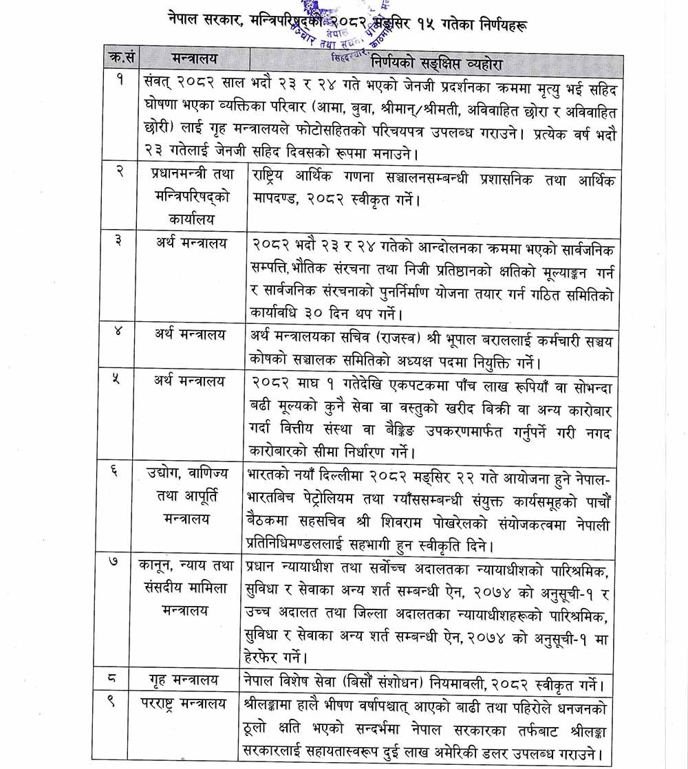 बैठकले जेनजी आन्दोलनका मृत्युवरण गरेका सहिदहरूको सम्झनामा प्रत्येक वर्ष भाद्र २३ गतेलाई जेनजी शहिद दिवसको रूपमा मनाउने निर्णय गरेको छ ।