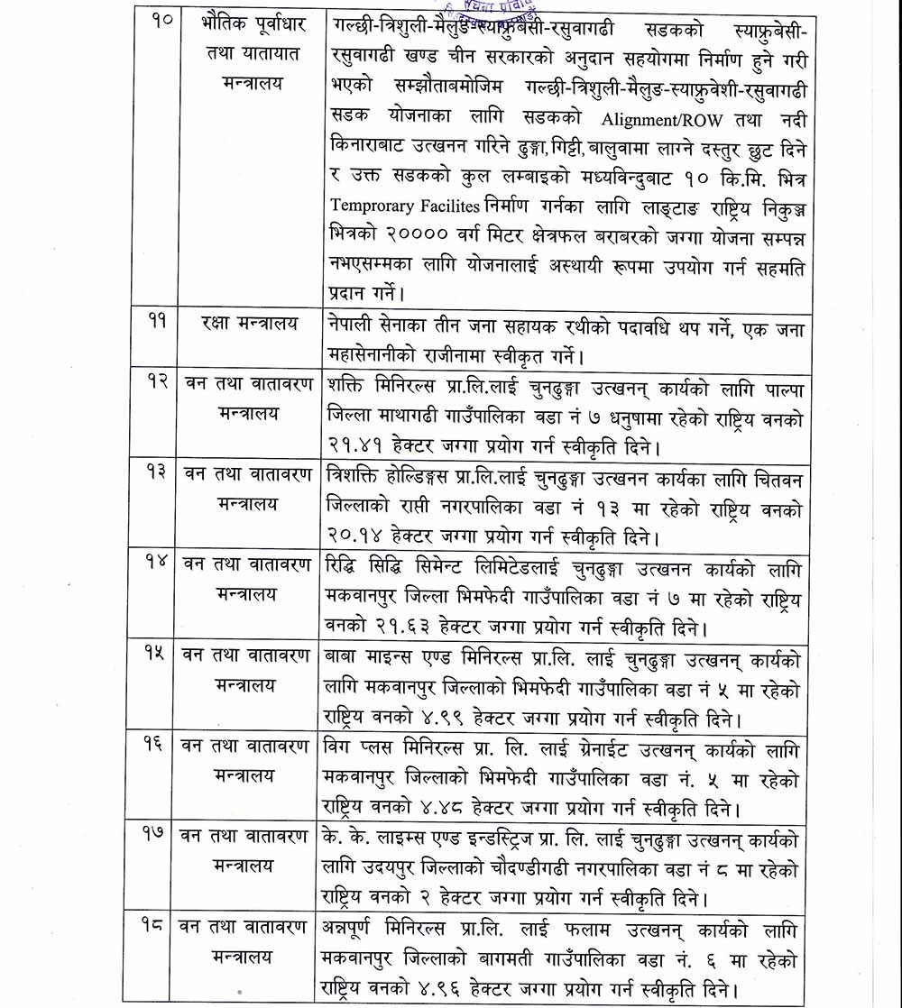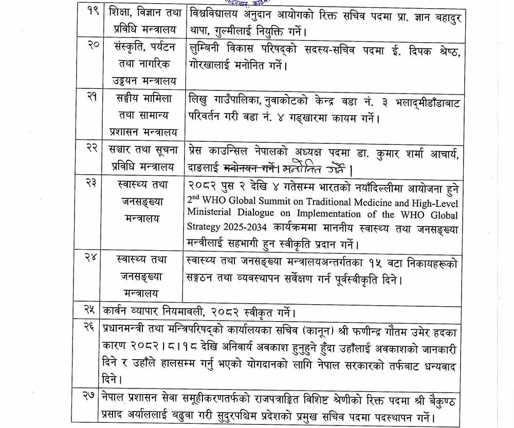 काठमाडौं । सोमबार बसेको मन्त्रिपरिषद बैठकले विभिन्न निर्णय गरेको छ । मंगलबार पत्रकार सम्मेलन गरी सञ्चार तथा सूचना प्रविधिमन्त्री तथा सरकारका प्रवक्ता जगदीश खरेलले मन्त्रिपरिषद बैठकका २७ निर्णय सार्वजनिक गरेका छन् ।
