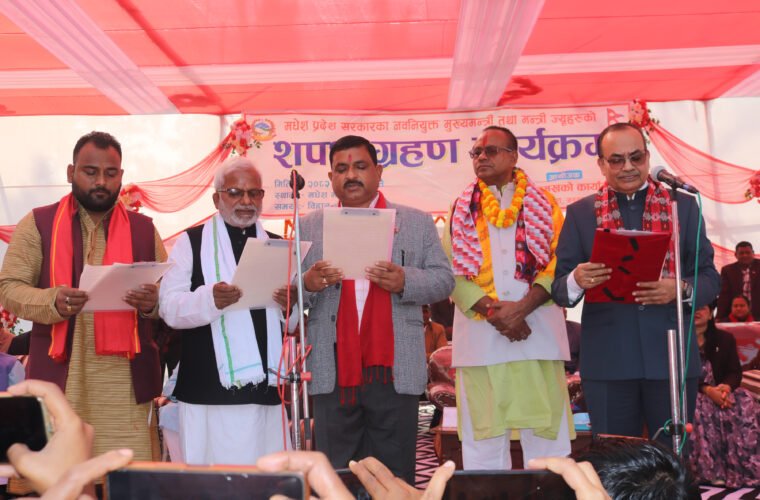 जनकपुरधाम । मधेश प्रदेश सरकारका नवनियुक्त मुख्यमन्त्री कृष्णप्रसाद यादवले तीन मन्त्री नियुक्त गरेका छन् । प्रदेश प्रमुखको कार्यालयमा आइतबार पद तथा गोपनीयताको शपथ लिएपछि मुख्यमन्त्री यादवले तीन मन्त्री नियुक्त गरेका हुन् ।