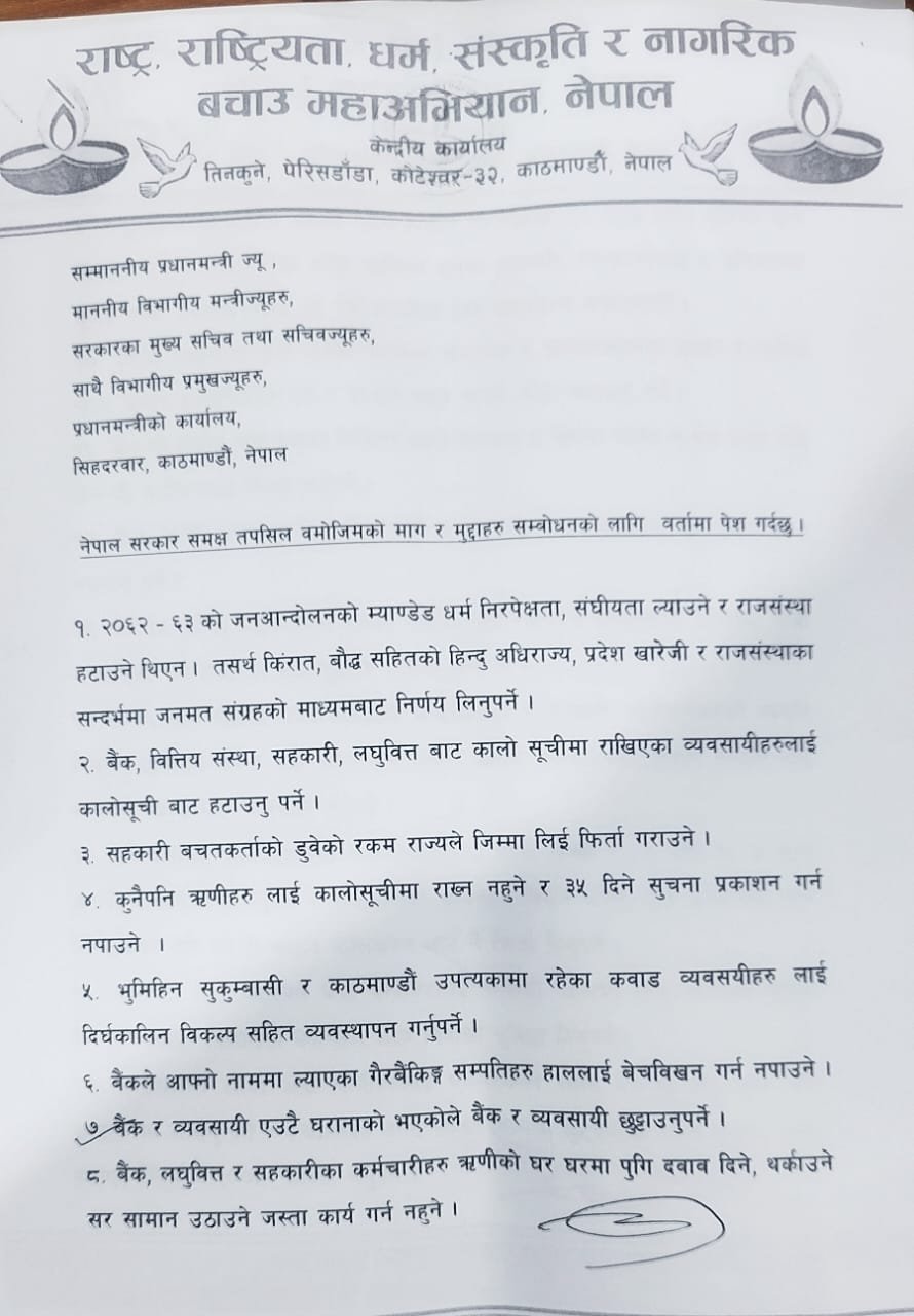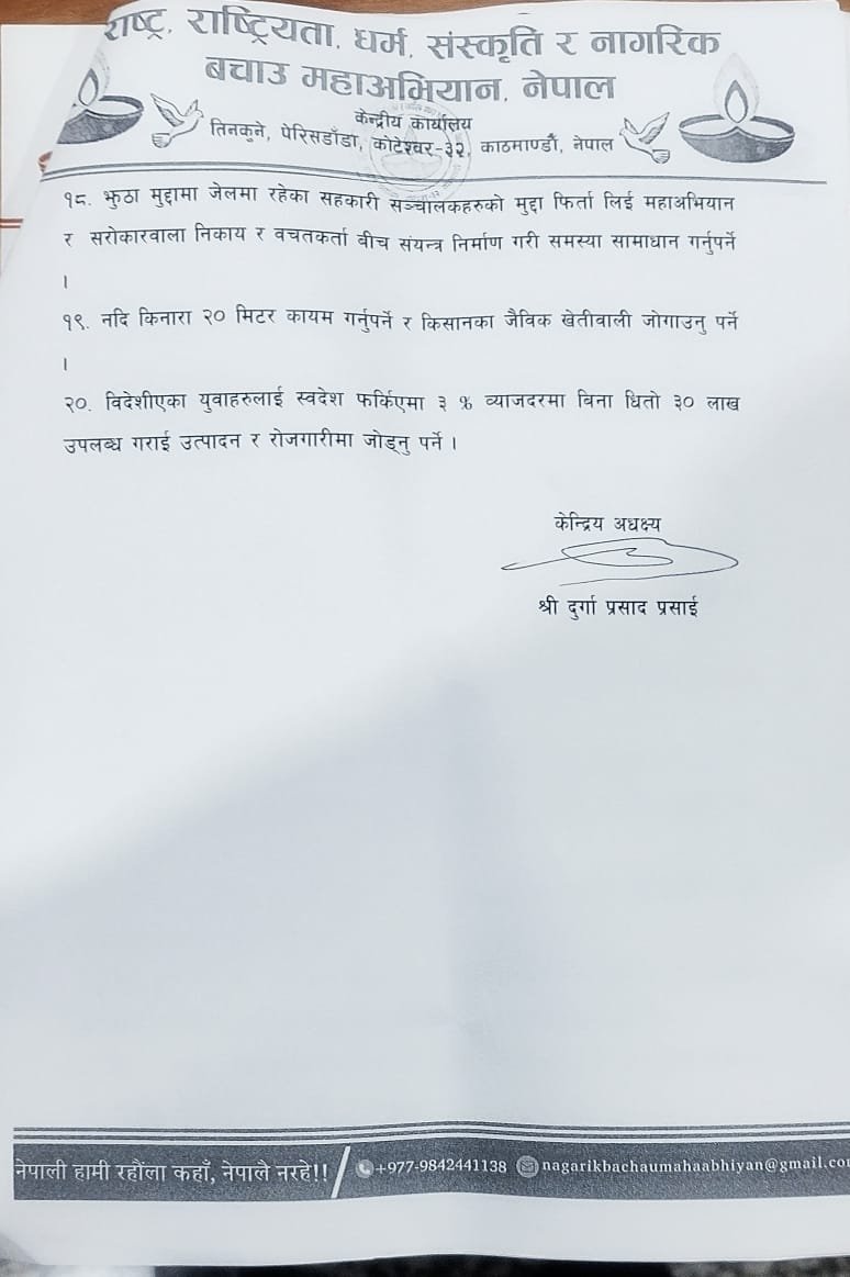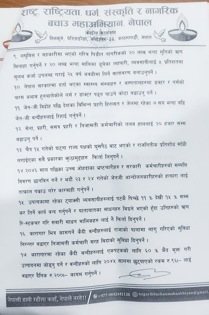 आजको वार्तामा उनले २० बुँदे माग राखेका छन् । त्यसक्रममा प्रसाईंले सरकारबाट आफ्ना माग पूरा भएको खण्डमा सरकारका लागि छाती थाप्न तयार रहेको बताएका छन् । सरकारले भने उनका मागहरूको अध्ययनका लागि समय माग गरेको छ ।
