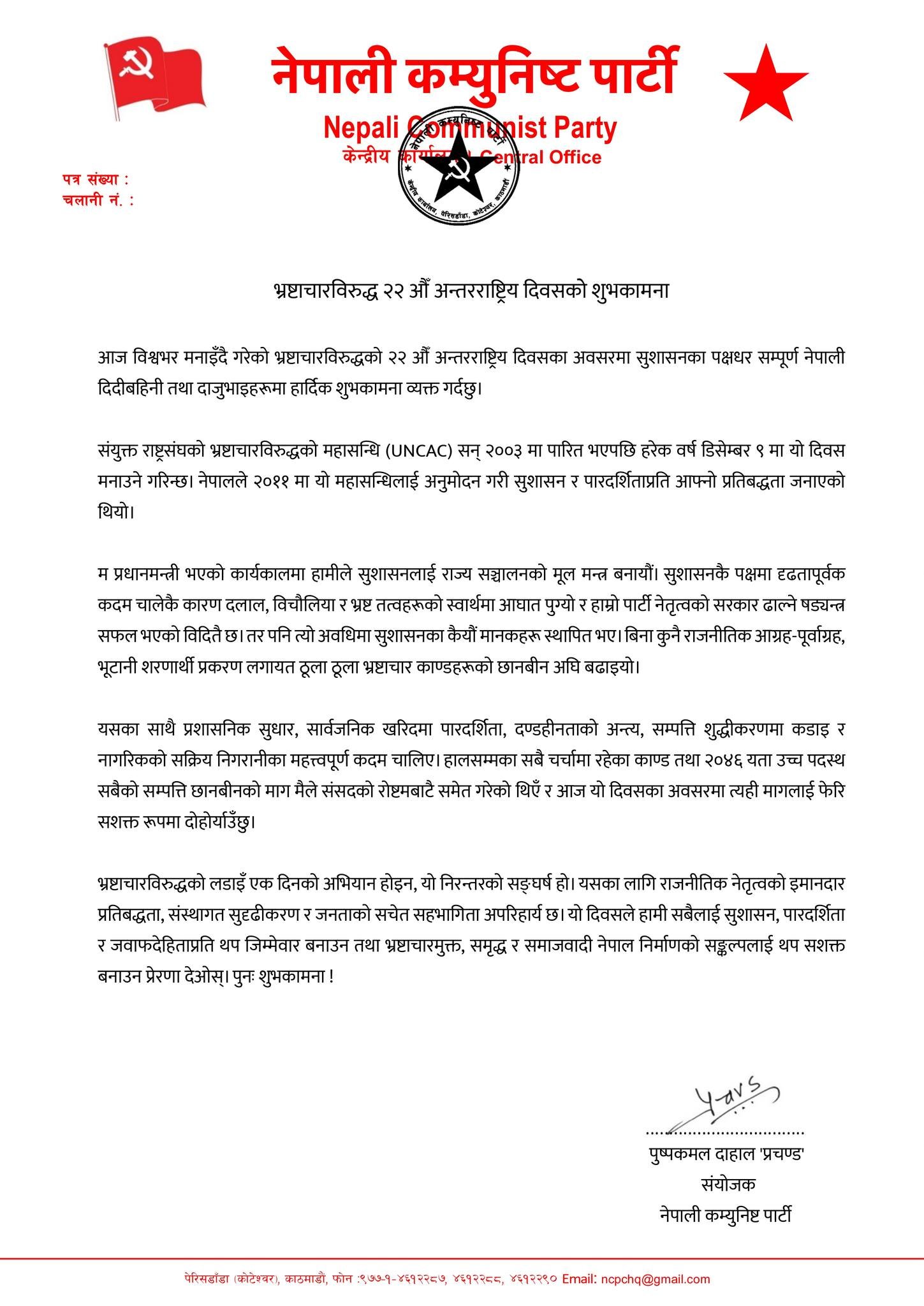 भ्रष्टाचारविरुद्ध २२ औँ अन्तर्राष्ट्रिय दिवसको अवसरमा शुभकामना सन्देश जारी गर्दै प्रचण्डले २०४६ यता उच्च पदस्थ सबैको सम्पत्ति छानबिनको आफूले संसदको रोष्टमबाटै समेत र अहिले पनि दोहोर्याउने बताए ।