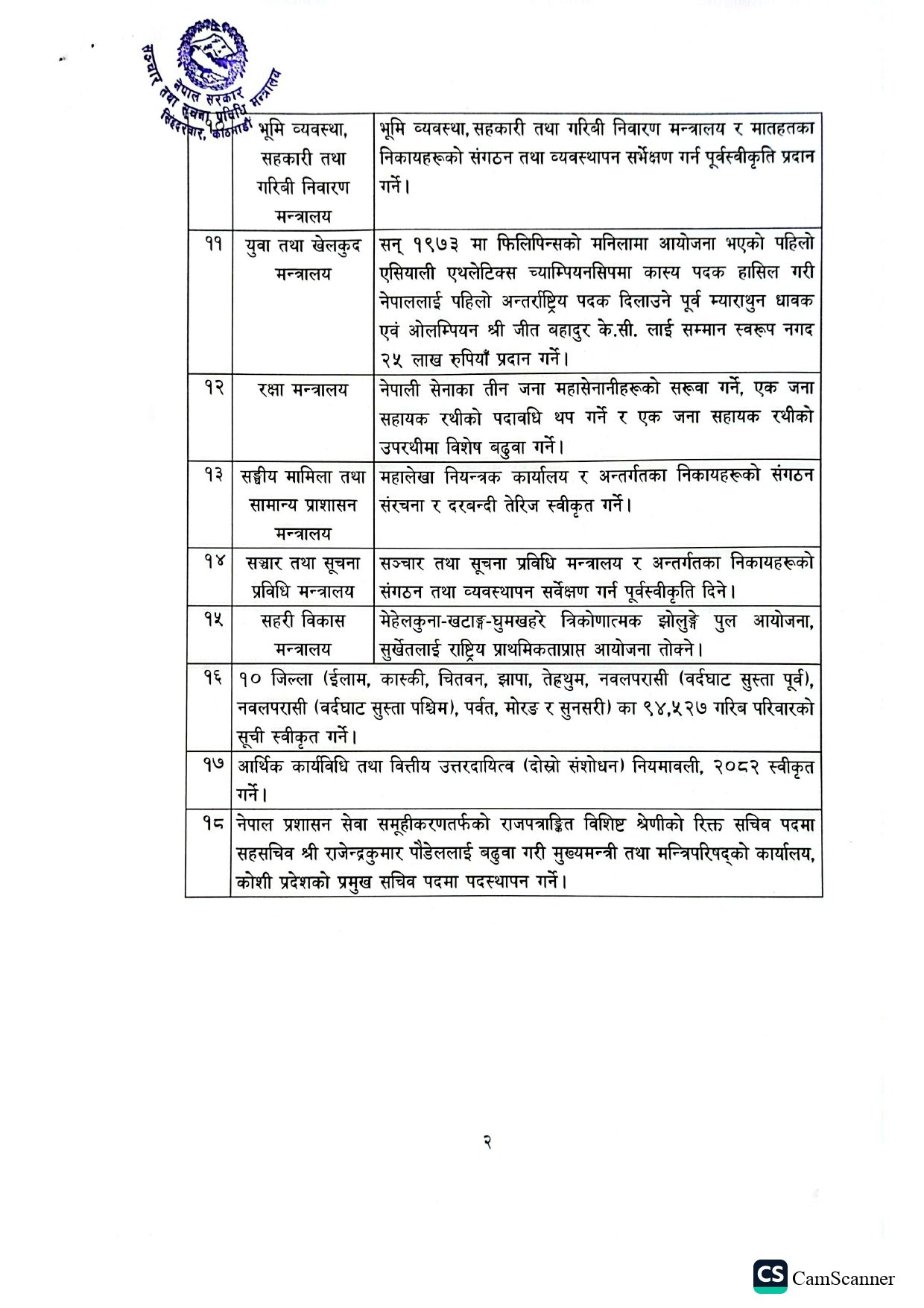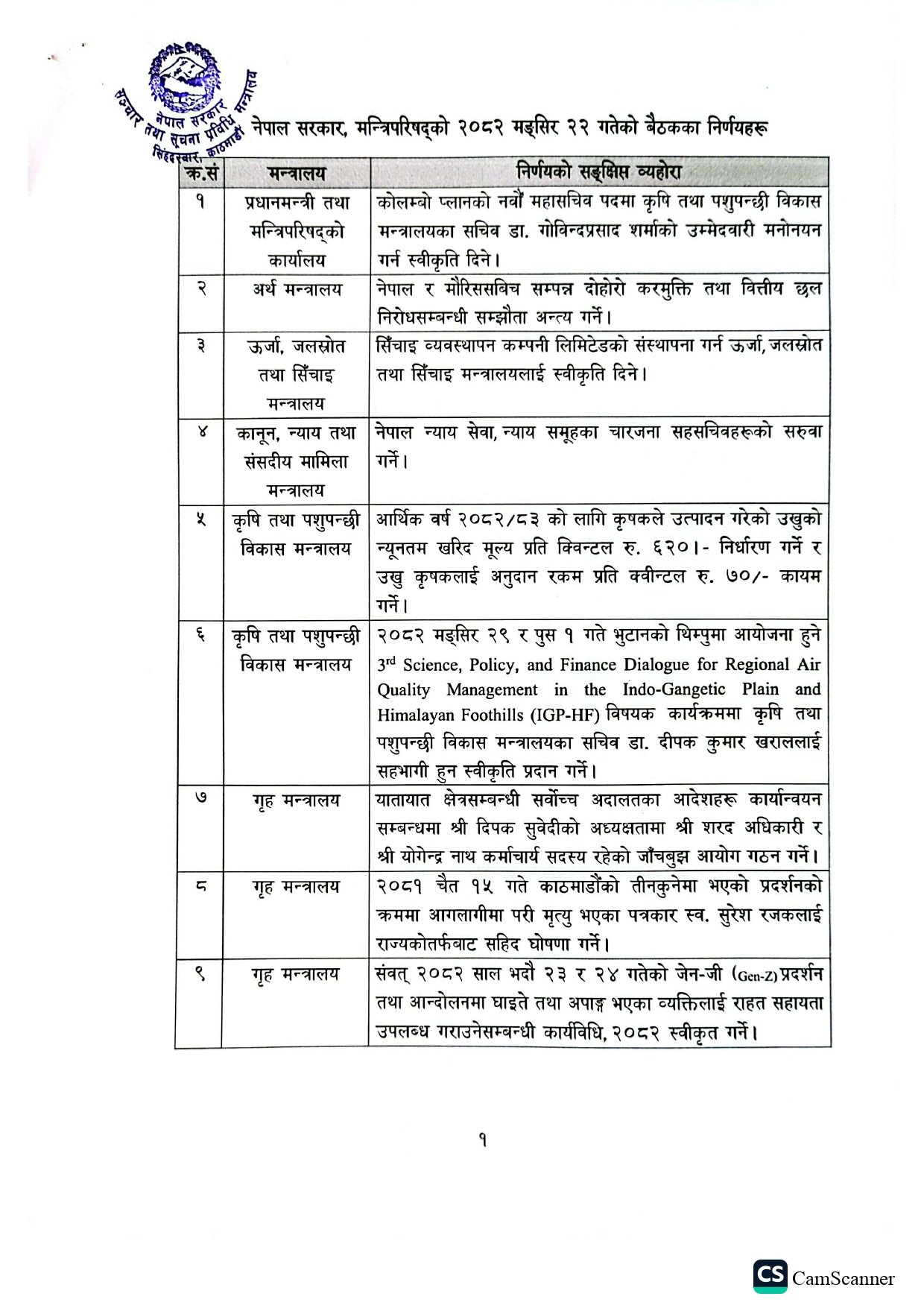 बैठकले कोलम्बो प्लानको नवौँ महासचिव पदमा मन्त्रालयका सचिव डा. गोविन्दप्रसाद शर्माको उम्मेदवारी मनोनयन गर्न स्वीकृति दिने निर्णय गरेको छ । त्यस्तै बैठकले १० जिल्ला (ईलाम, कास्की, चितवन, झापा, तेह्रथुम, नवलपरासी (वर्दघाट सुस्ता पूर्व), ।