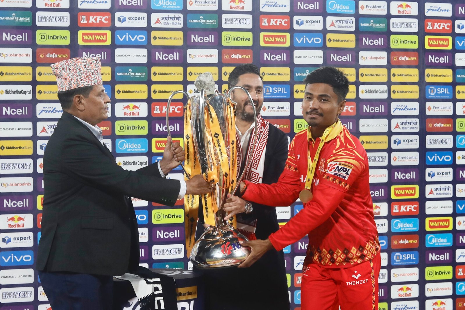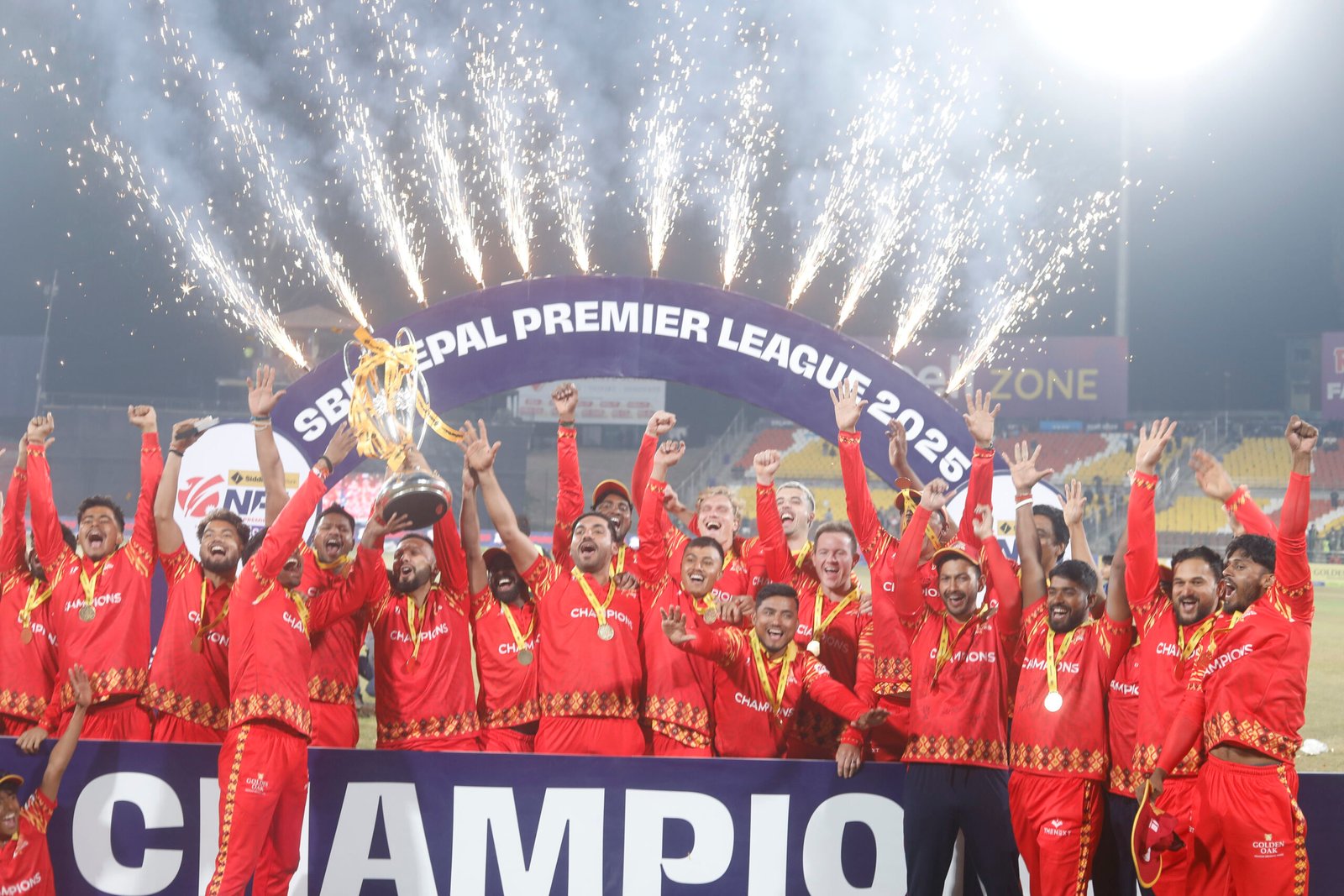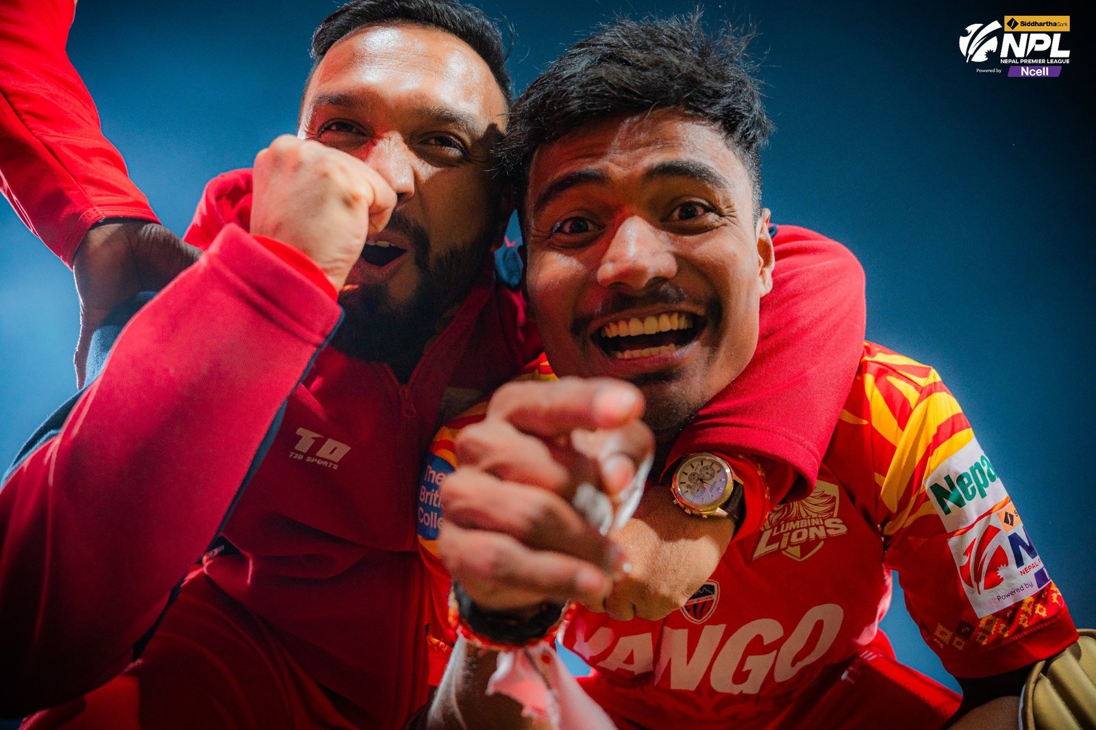 कीर्तिपुरस्थित टियु खेल मैदानमा सम्पन्न नेपाल प्रिमियर लिग (एनपिएल)को दोस्रो संस्करण अन्तर्गत शनिबारको फाइनल खेलमा लुम्बिनी लायन्सले सुदूरपश्चिम रोयल्सलाई ६ विकेटले पराजित गर्दै नेपाल प्रिमियर लिग (एनपीएल) को उपाधि जितेपछि ट्रफीका साथ लुम्बिनी लायन्सका खेलाडी र टोलीको सेलिब्रेसन ।