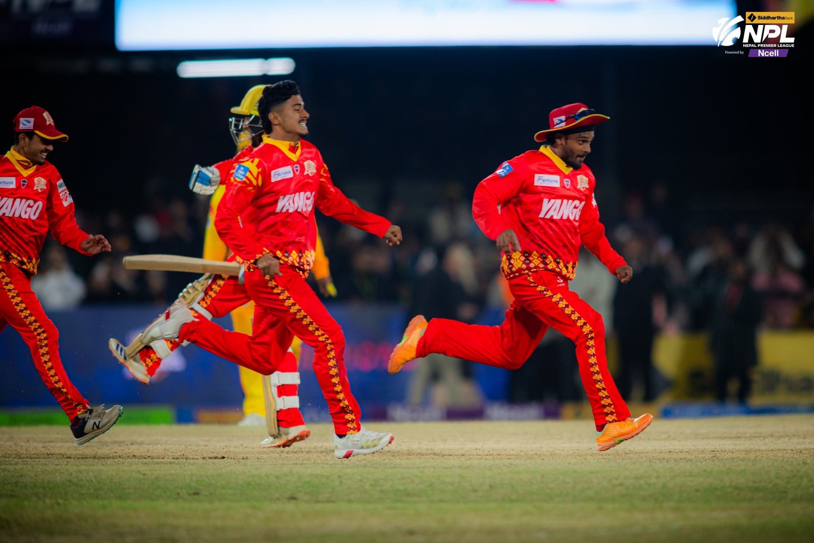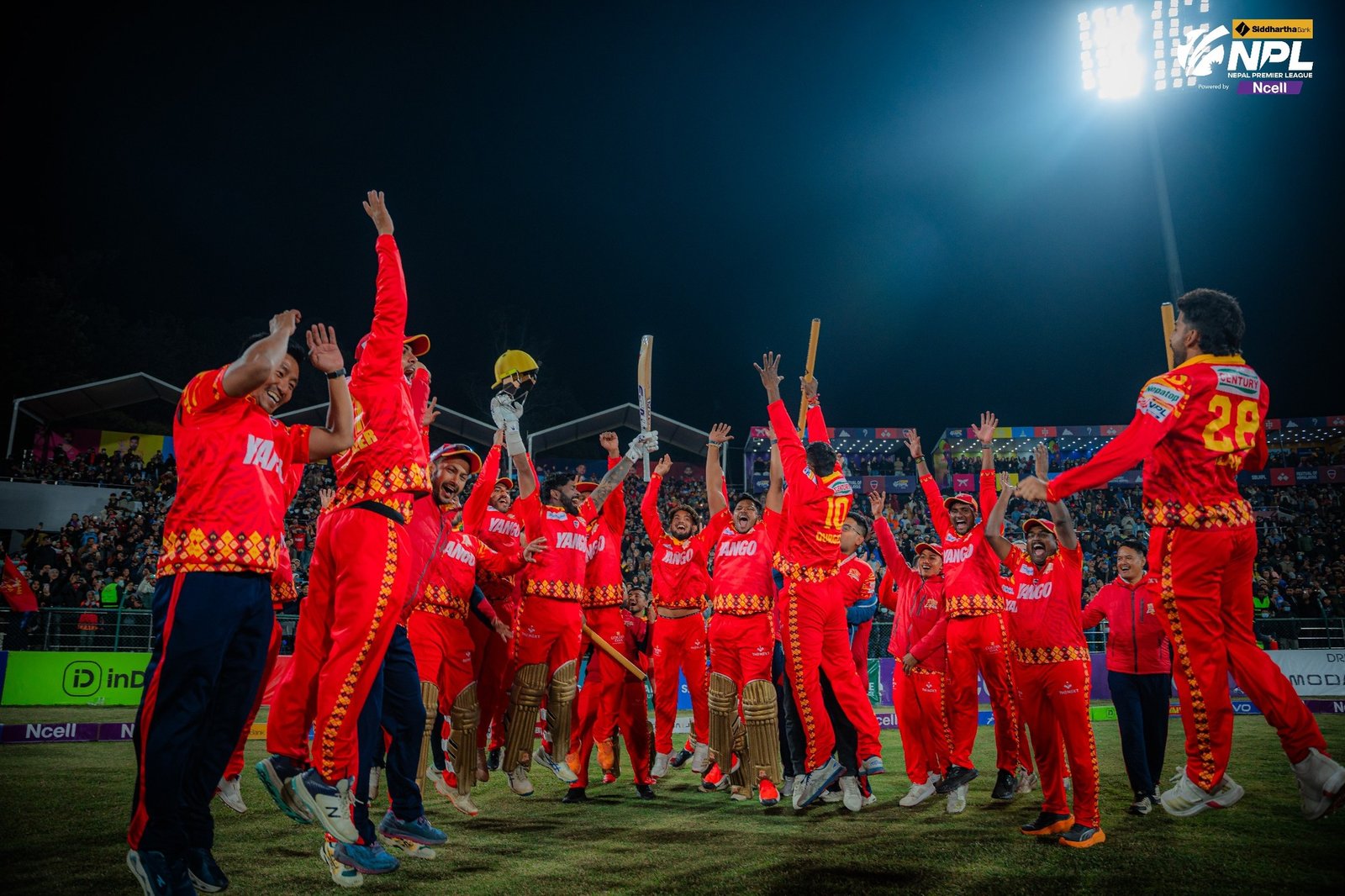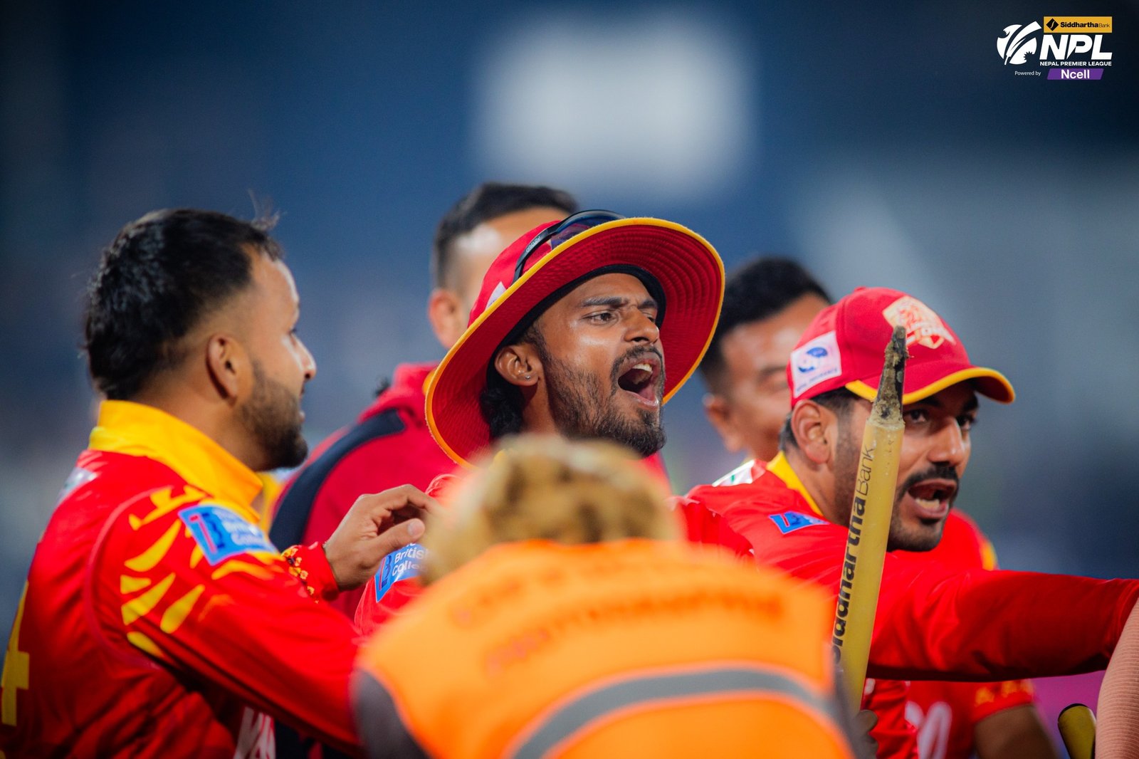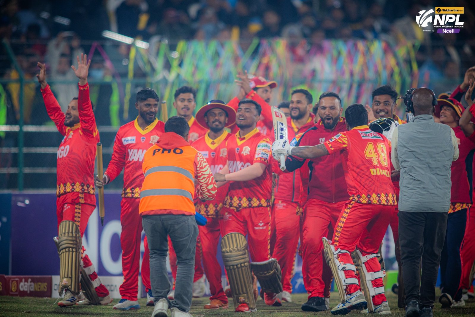 कीर्तिपुरस्थित टियु खेल मैदानमा सम्पन्न नेपाल प्रिमियर लिग (एनपिएल)को दोस्रो संस्करण अन्तर्गत शनिबारको फाइनल खेलमा लुम्बिनी लायन्सले सुदूरपश्चिम रोयल्सलाई ६ विकेटले पराजित गर्दै नेपाल प्रिमियर लिग (एनपीएल) को उपाधि जितेपछि ट्रफीका साथ लुम्बिनी लायन्सका खेलाडी र टोलीको सेलिब्रेसन ।