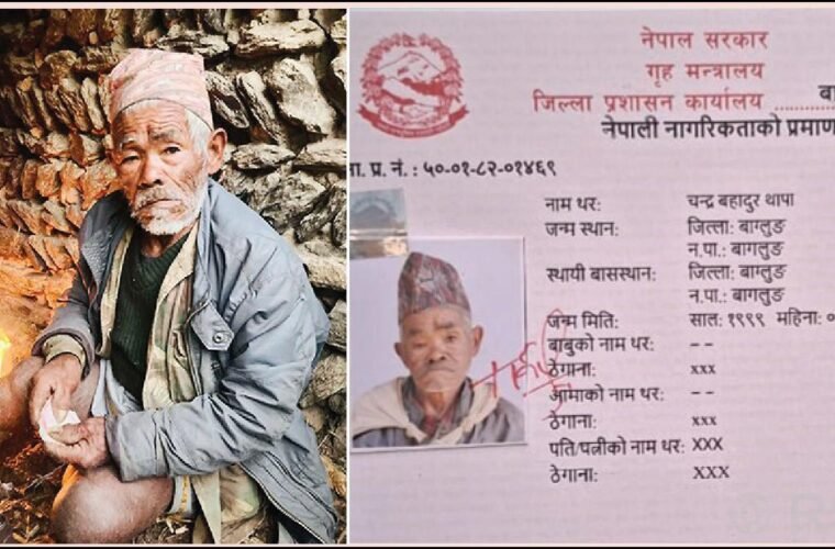 बागलुङ। बागलुङ नगरपालिका–१० भकुण्डेमा बस्दै आएका एक ८३ वर्षीय वृद्धले नागरिकता प्राप्त गर्नुभएको छ । २०८१ फागुन २ गते राष्ट्रिय समाचार समितिमा ‘बूढेसकालमा नाम खोजिरहेका धान्द्रुके बाजे’ शीर्षकमा समाचार प्रकाशित भएपछि उनी नागरिकताबाट वञ्चित भएको बारेमा उजागर भएको थियो ।