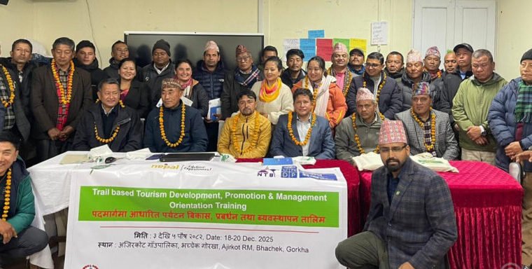 पदमार्ग विकास कार्ययोजनाको तयारीका लागि गोरखाको अजिरकोट गाउँपालिकाको भच्चेकमा आयोजना गरिएको क्षमता अभिवृद्धि तालिमको आज समापन भएको छ । नयाँ अन्वेषण गरिएको पदमार्गको विकास, प्रवद्र्धन र व्यवस्थापनका लागि सरोकारवालाको क्षमता सुदृढ गर्ने उद्देश्यले आयोजित तीनदिने तालिममा पाँचवटै पालिकाका उपाध्यक्षहरूसहित पर्यटन उद्यमीहरू, सामुदायिक वन उपभोक्ता समूह, पशुधन उद्यमीहरू, सांस्कृतिक समूहका सदस्यहरू गरी कूल २५ जनाको सहभागिता रहेको थियो ।
