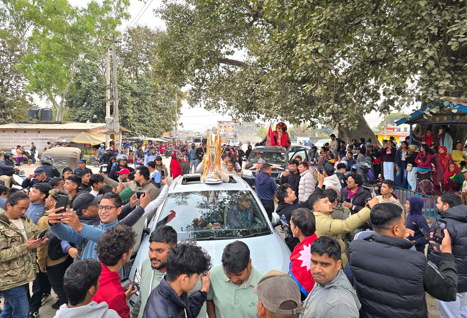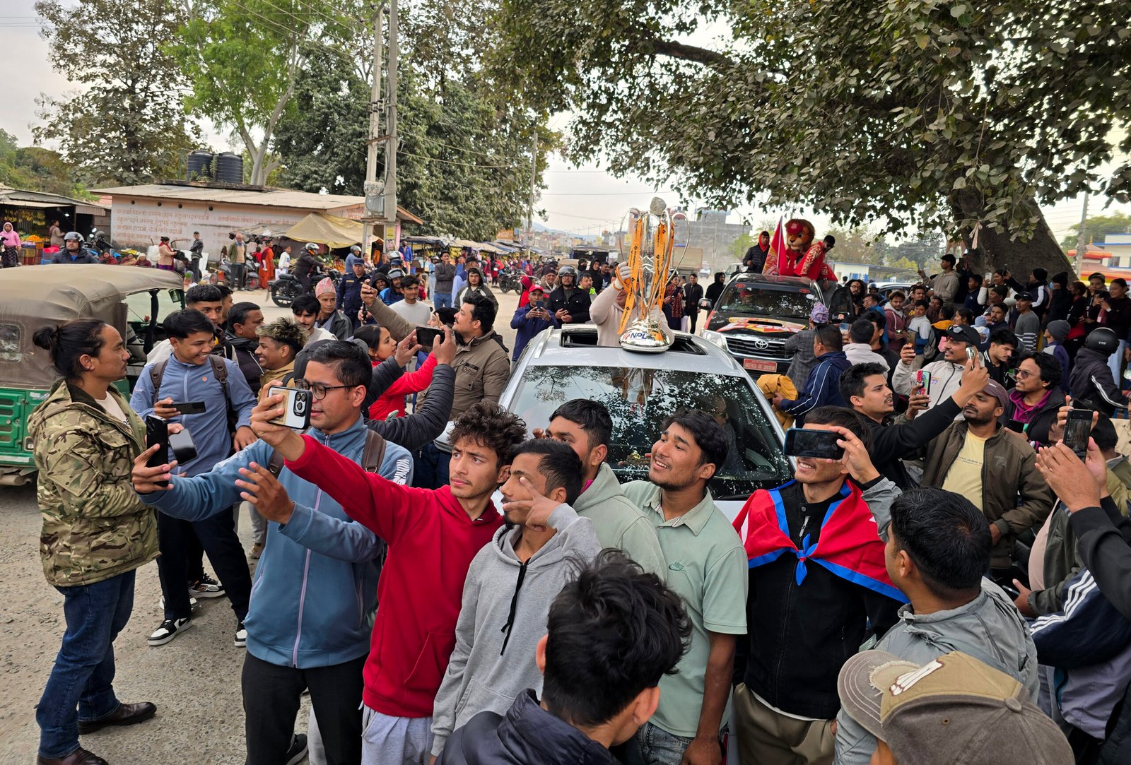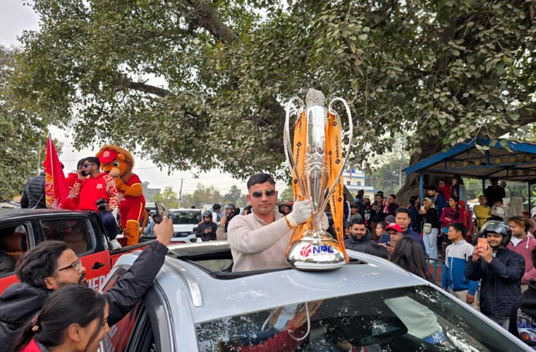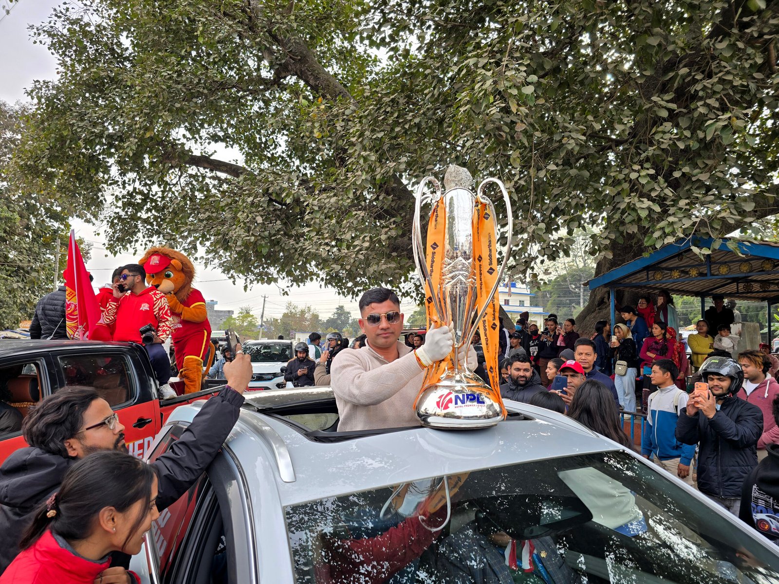 एनपिएल विजेताको विजय उत्सव ६ पुष, २०८२नेपाल समाजखेलकुद नेपाल प्रिमियर लिग (एनपिएल) सिजन–२ को उपाधि जितेको लुम्बिनी लायन्सको खुशीमा आइतबार ट्रफीलाई लुम्बिनी प्रदेशको राजधानी दाङको सदरमुकाम घोराहीमा प्रदर्शनी गरेर बजार परिक्रमा गराउँदै स्थानीय खेलप्रेमी। तस्बिरः कुलदीप न्यौपाने/रासस