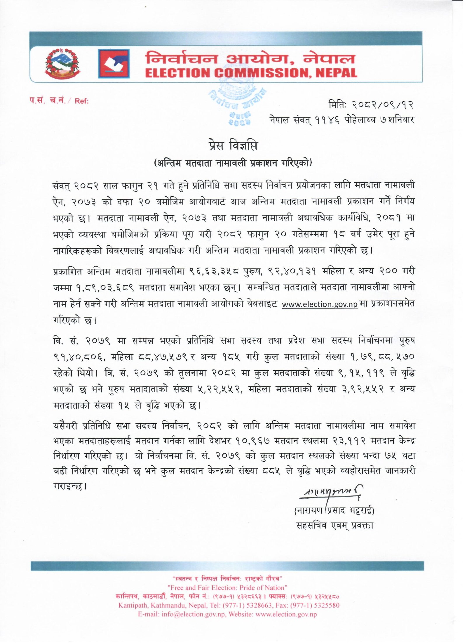 प्रकाशित अन्तिम मतदाता नामालीमा ९६,६३,३५८ पुरुष, ९२,४०,१३१ महिला र २०० अन्य गरी जम्मा १,८९,०३,६८९ मतदाता रहेका छन् । अन्तिम मतदाता नामावली आयोगको वेवसाइटबाट हेर्न सकिनेछ ।