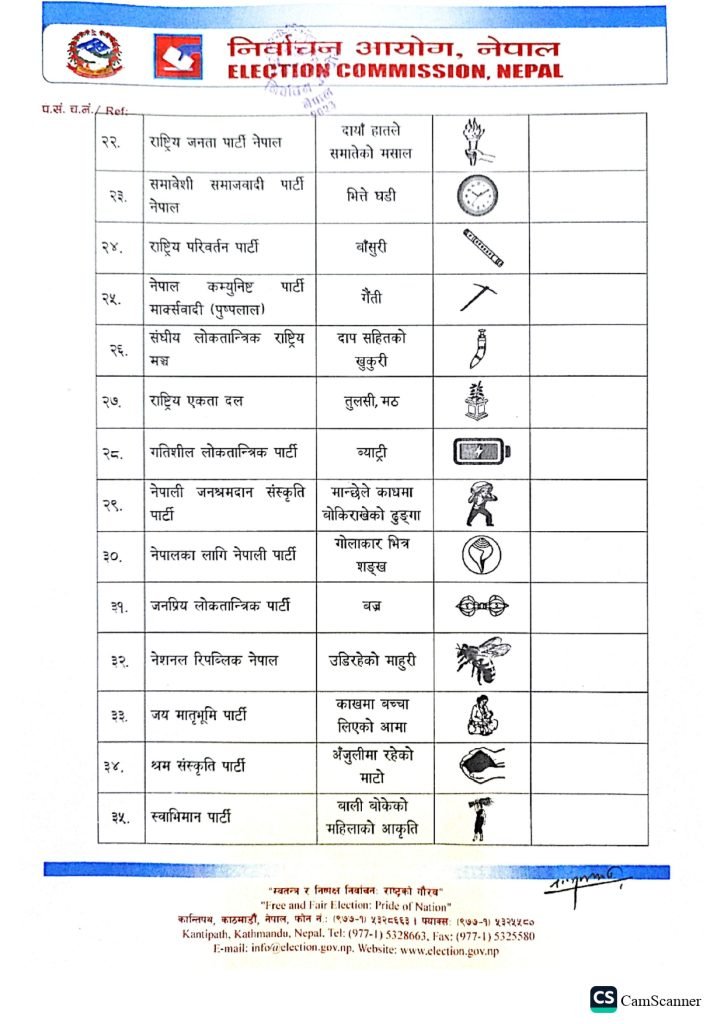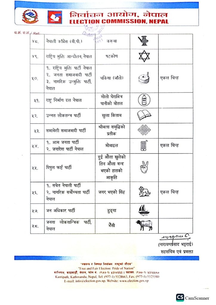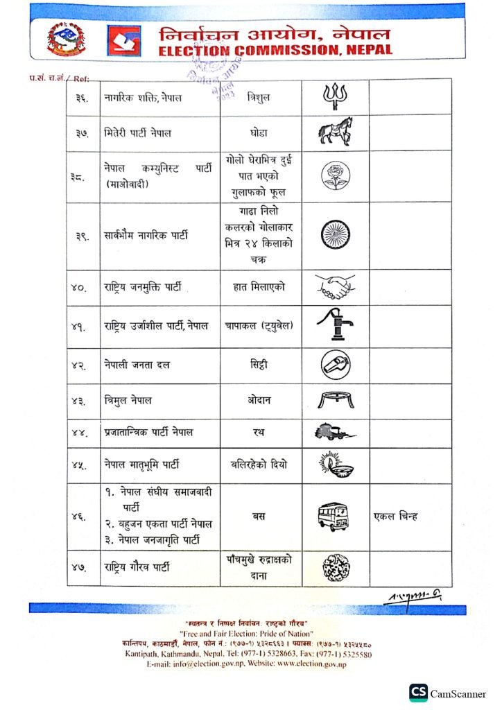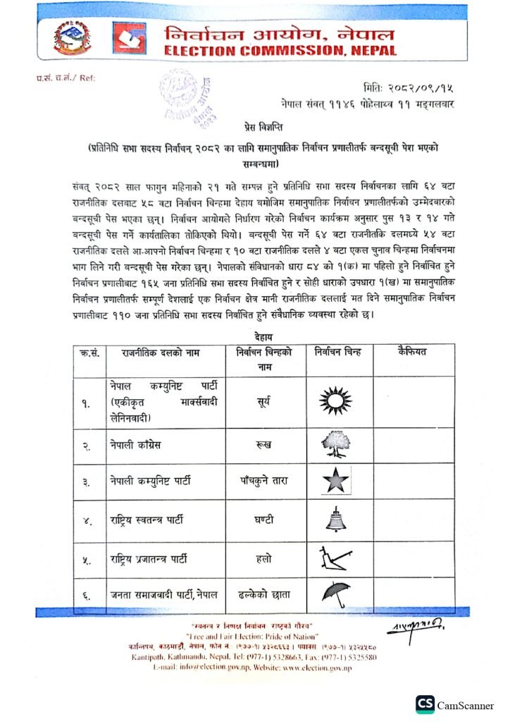 आयोगका अनुसार ६४ वटा राजनीतिक दलबाट ५८ वटा निर्वाचन चिह्नमा चुनाव लड्ने गरी समानुपातिक उम्मेदवारको बन्दसूची पेस भएको हो । आयोगले १० वटा दलले ४ वटा एकल चुनाव चिह्नमा निर्वाचनमा भाग लिने गरी बन्दसूची पेस गरेका जानकारी दिएको छ ।