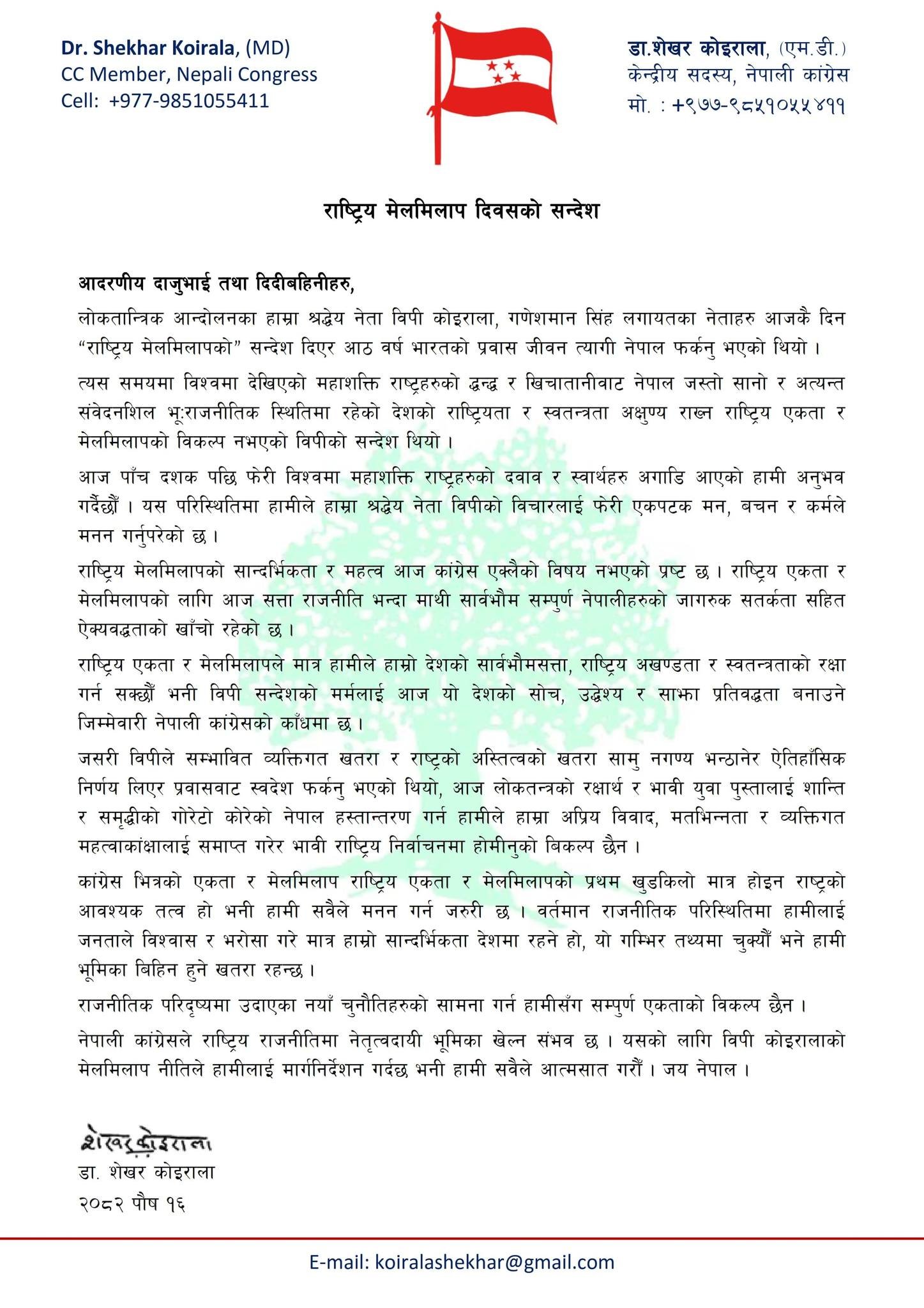 राष्ट्रिय एकता र मेलमिलाप दिवसका अवसरमा शुभकामना सन्देश दिँदै कोइरालाले कांग्रेस भित्रको एकता र मेलमिलाप राष्ट्रिय एकता र मेलमिलापको प्रथम खुडकिलो मात्र नभई राष्ट्रको आवश्यक तत्व हो भनी हामी सवैले मनन गर्न जरुरी रहको बताएका हुन् ।