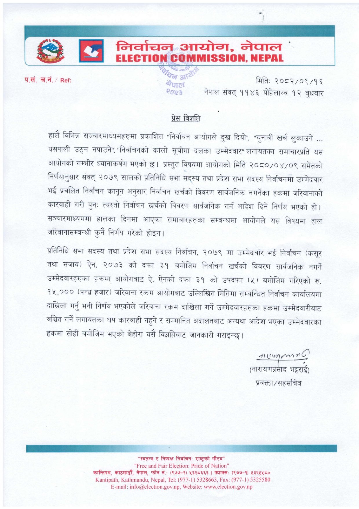 विज्ञप्तिमा भनिएको छ, ‘हालै विभिन्न सञ्चारमाध्यमहरुमा प्रकाशित ‘निर्वाचन आयोगले दुःख दियो’, ‘चुनावी खर्च लुकाउने .. यसपाली उठ्न नपाउने’, ‘निर्वाचनको कालो सूचीमा दलका उम्मेदवार’ लगायतका समाचारप्रति आयोगको गम्भीर ध्यानाकर्षण भएको छ । प्रस्तुत विषयमा आयोगको मिति २०८०/०४/०९ समेतको निर्णयानुसार संवत् २०७९ सालको प्रतिनिधि सभा सदस्य तथा प्रदेश सभा सदस्य निर्वाचनमा उम्मेदवार भई प्रचलित निर्वाचन कानून अनुसार निर्वाचन खर्चको विवरण सार्वजनिक नगर्नेका हकमा जरिवानाको कारवाही गरी पुनः त्यस्तो निर्वाचन खर्चको विवरण सार्वजनिक गर्न आदेश दिने निर्णय भएको हो । सञ्चारमाध्यममा हालका दिनमा आएका समाचारहरुका सम्बन्धमा आयोगले यस विषयमा हाल जरिवानासम्बन्धी कुनै निर्णय गरेको होइन ।’