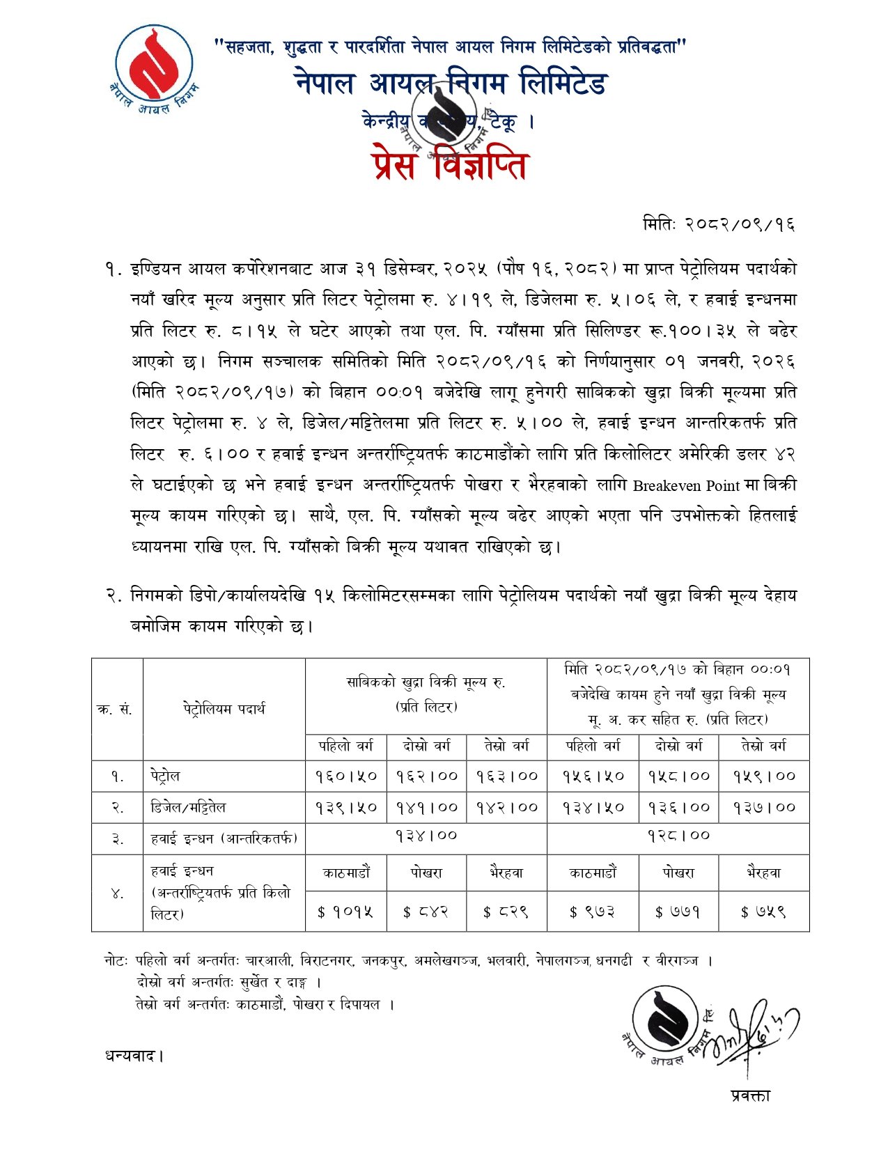 त्यस्तै हवाई इन्धनमा आन्तरिक तर्फ प्रतिलिटर ६ रुपैयाँले घटाएको निगमले जनाएको छ । त्यस्तै अन्तर्राष्ट्रिय इन्धनमा प्रति किलो लिटर ४२ डलरले घटाएको छ ।