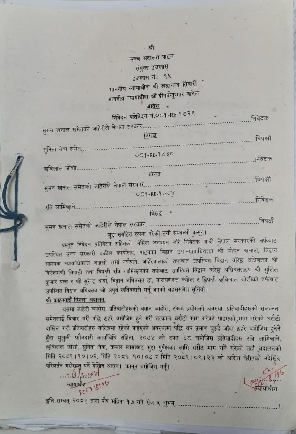 बिहीबार न्यायाधीश खडानन्द तिवारी र दीपककुमार खरेलको इजलासले जिल्ला अदालतले गरेको आदेशलाई परिवर्तन गर्न नपर्ने आदेश दिएको हो ।