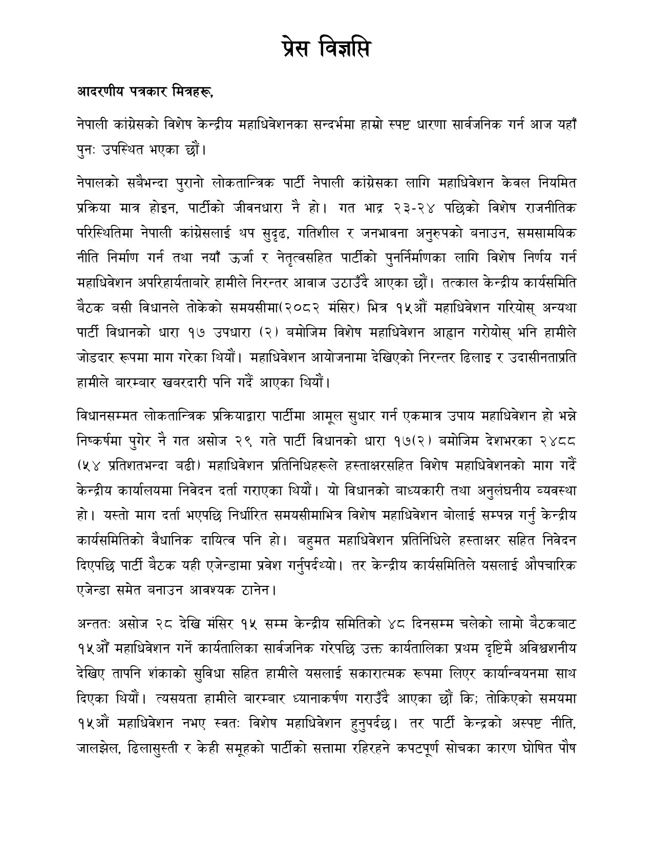 विशेष महाधिवशेन पक्षधरले भन्यो-कांग्रेससँग विशेष महाधिवेशनबाहेक अन्य कुनै विकल्प बाँकी छैन, नेतृत्वले बुझोस्
