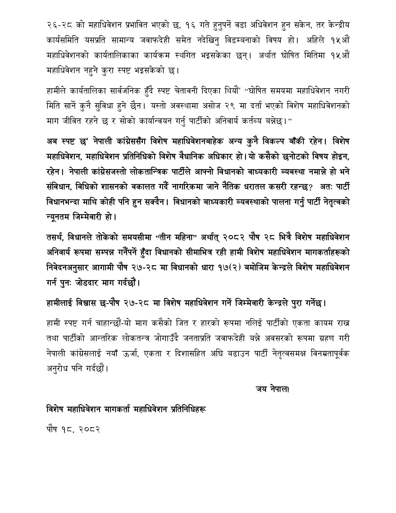उनीहरुले विशेष महाधिवेशन मागकर्ताहरूको निवेदनअनुसार पुुस २७–२८ मा विधानको धारा १७(२) बमोजिम केन्द्रले विशेष महाधिवेशन गर्न पुनः जोडदार माग गरेको छ ।