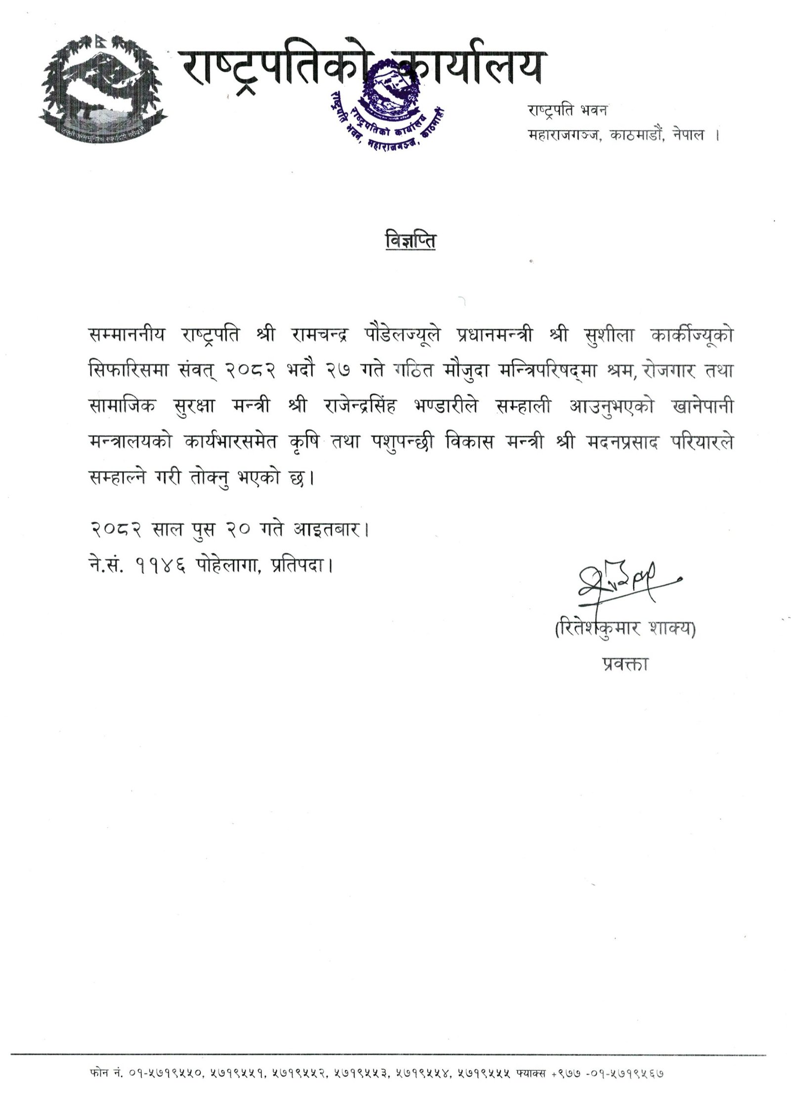 मन्त्रिपरिषद्मा श्रम, रोजगार तथा सामाजिक सुरक्षा राजेन्द्रसिंह भण्डारीले सम्हालेको खानेपानी मन्त्रालयको कार्यभारसमेत कृषि तथा पशुपन्छी विकासमन्त्री मदनप्रसाद परियारले सम्हाल्ने गरी तोकिएको राष्ट्रपति कार्यालयद्वारा जारी विज्ञप्तिमा उल्लेख छ ।