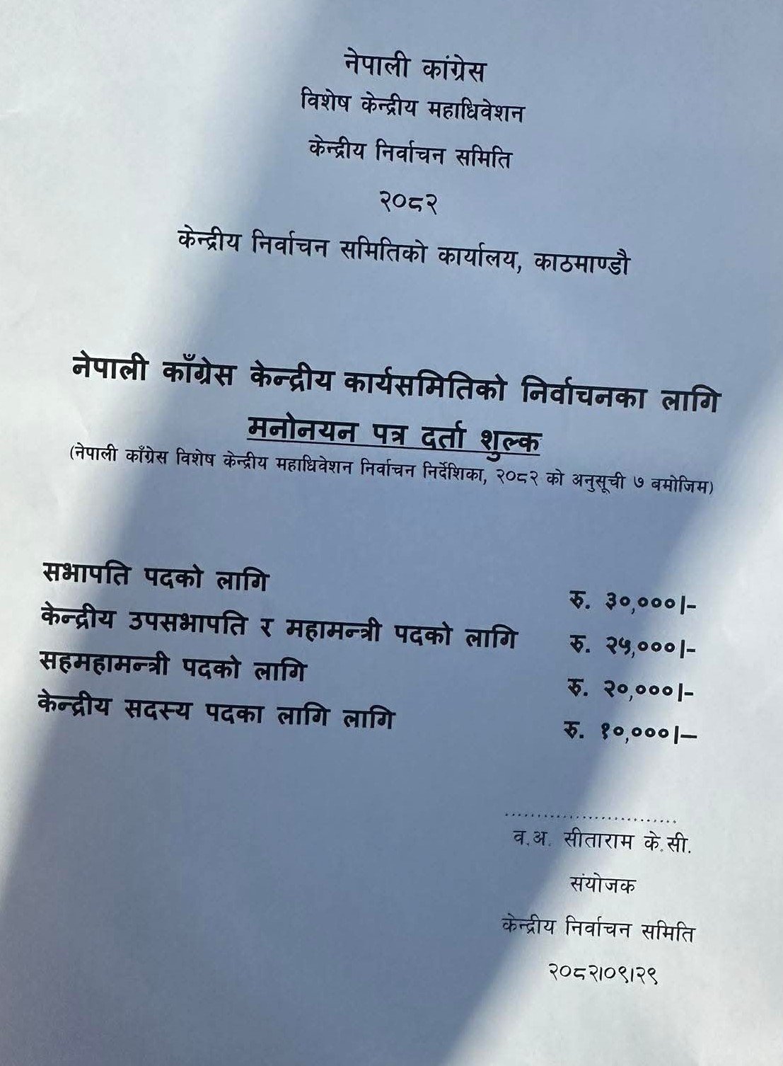 काठमाडौं । नेपाली कांग्रेसको विशेष महाधिवेशमा पार्टीको सभापति पदमा उम्मेदवारी दिनका लागि ३० हजार रुपैयाँ शुल्क तोकिएको छ ।