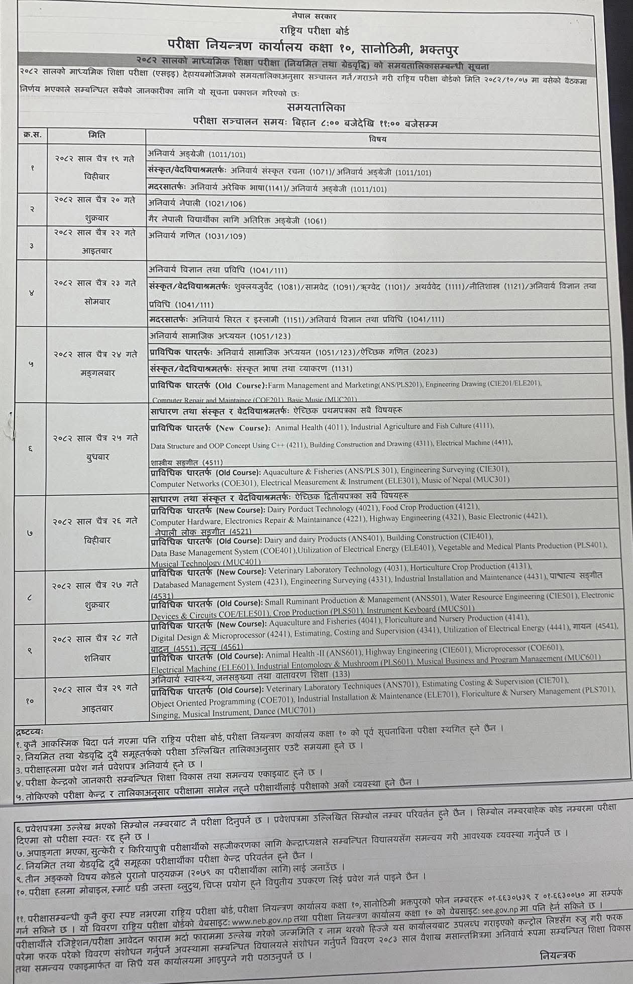 एसईईको परीक्षा तालिका सार्वजनिक ७ माघ, २०८२नेपाल समाजस्वास्थ्य / शिक्षा, मुख्य समाचार काठमाडौं । राष्ट्रिय परीक्षा बोर्डले माध्यमिक शिक्षा परीक्षा (एसईई)को समयतालिका सार्वजनिक गरेको छ । २०८२ सालको एसईई परीक्षा चैत्र १९ गते बिहीबारदेखि चैत्र २९ गते आइतबारसम्म सञ्चालन हुने भएको छ । यस्तो छ समय तालिका