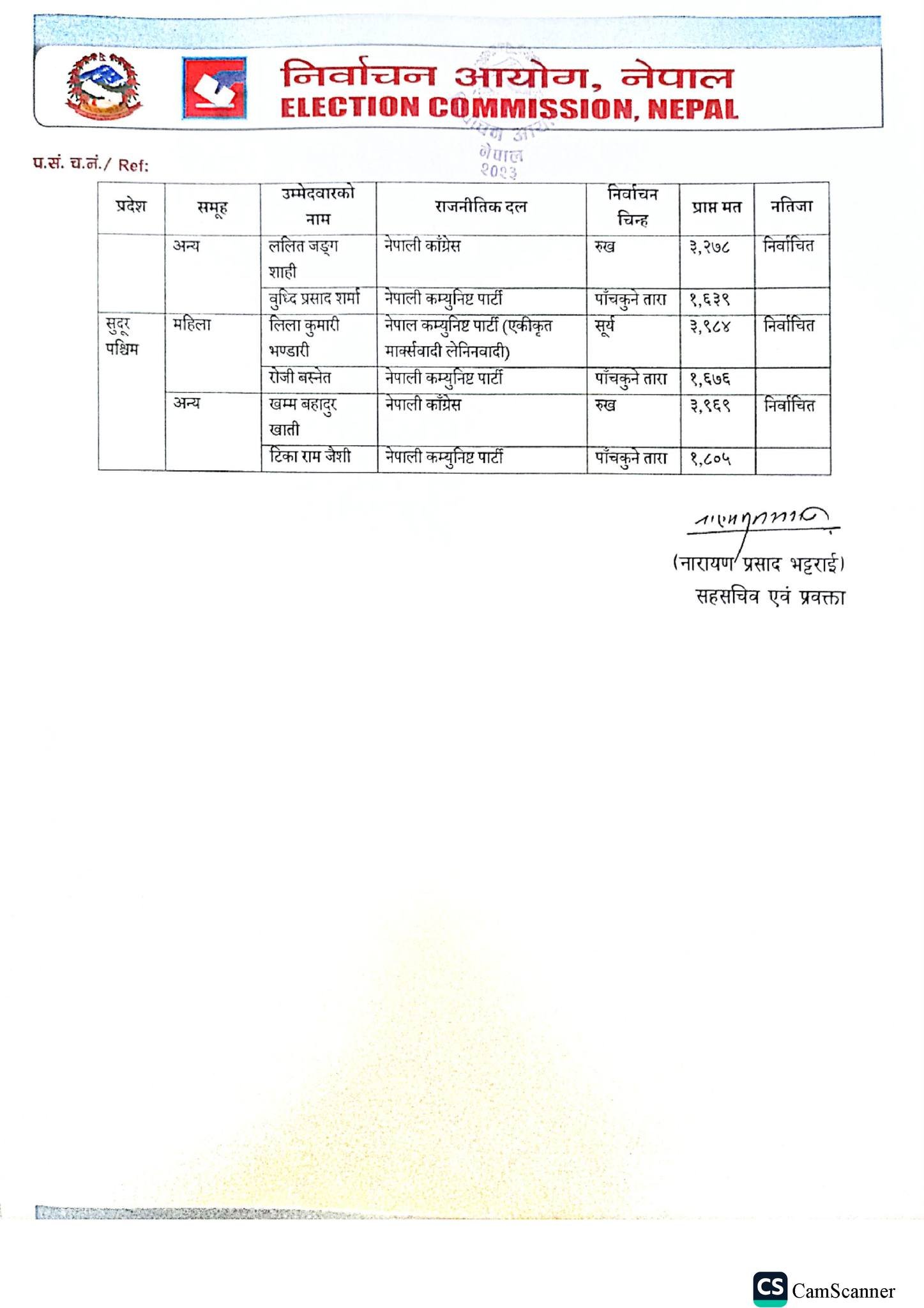 कर्णाली प्रदेशबाट कांग्रेसका ललितजंग शाही, एमालेकी मीनासिंह रखाल तथा सुदूरपश्चिम प्रदेशबाट एमालेकी लीलाकुमारी भण्डारी र खम्मबहादुर खाती निर्वाचित भएका छन् । राष्ट्रियसभामा रिक्त रहेको १८ पदका लागि आइतबार निर्वाचन भएको थियो ।