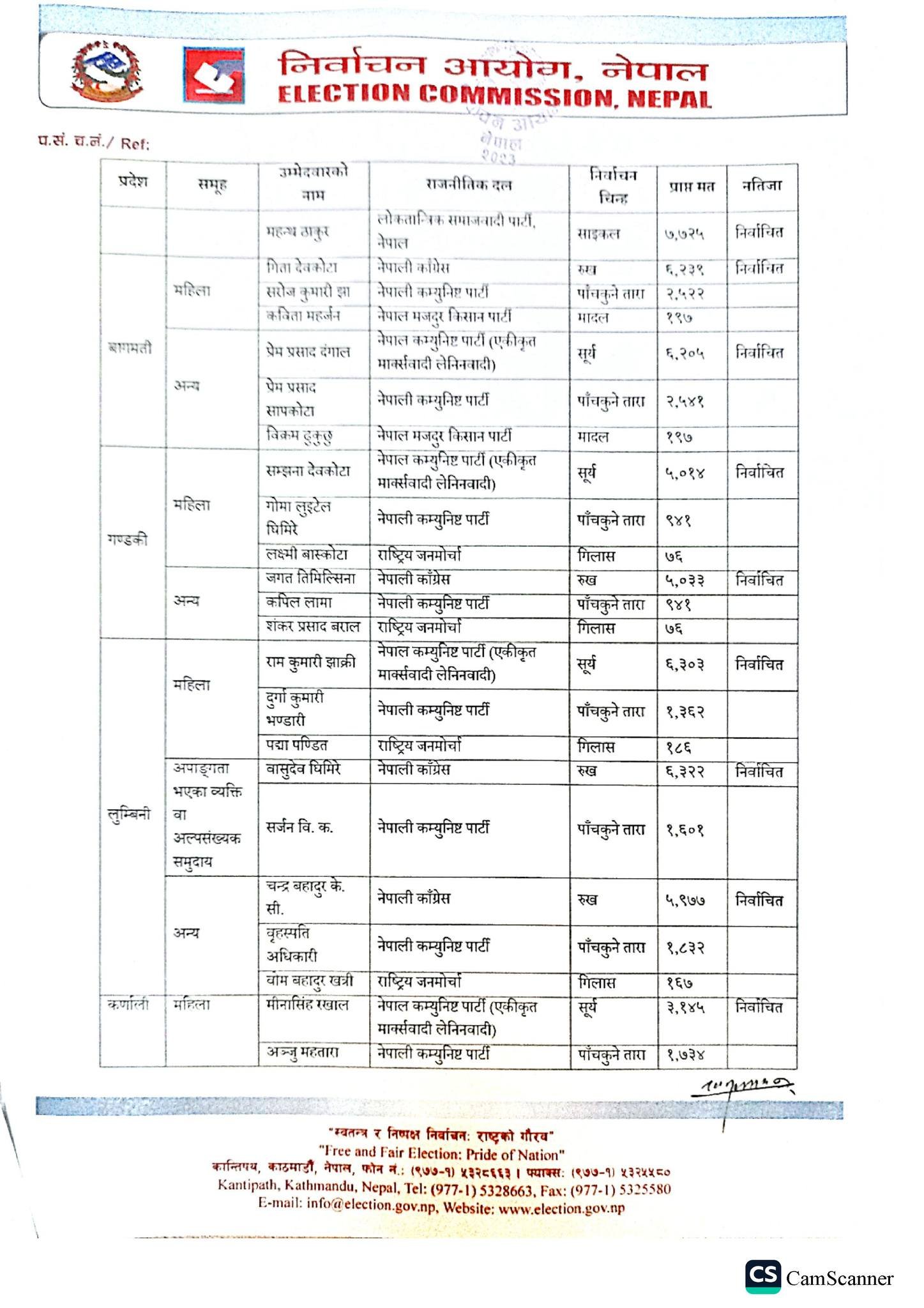 आइतबार भएको निर्वाचनको आयोगले साँझ अन्तिम परिणाम सार्वजनिक गरेको हो । निर्वाचनमा कोशी प्रदेशबाट कांग्रेसका सुनिलबहादुर थापा, एमालेकी रोशनी मेचे, एमालेका सोमनाथ पोर्तेल निर्वाचित भएका छन् । त्यस्तै मधेस प्रदेशबाट कांग्रेसका धमेन्द्र पासवान, रञ्जित कर्ण, लोसपाका महन्थ ठाकुर र एमालेकी रेखाकुमारी झा निर्वाचित भए ।