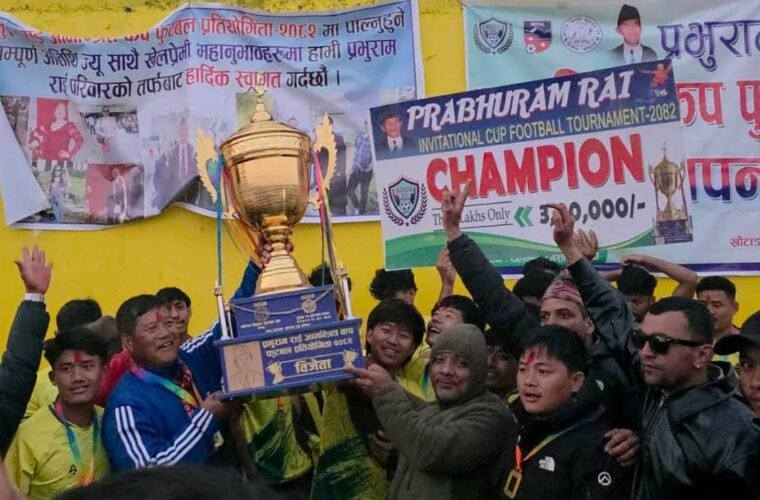 खोटाङ । दिक्तेल रुपाकोट मझुवागढी नगरपालिका–१४ बुइपामा सम्पन्न जिल्लाकै सर्वाधिक राशिको ‘प्रभुराम राई आमन्त्रित फुटबल कप–२०८२’को उपाधि नेर्पा स्पोर्टस क्लब नेर्पाले जितेको छ । बुइपास्थित यलम्बर खेलमैदानमा आइतबारसम्पन्न फाइनल खेलमा गछिया युवा समाज मोरङलाई ट्राइब्रेकरमा ५–४ गोलअन्तरले पराजित गर्दै नेर्पा स्पोर्टस क्लब नेर्पा खोटाङले उपाधि जितेको हो ।