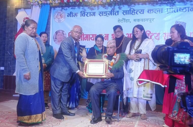 हेटौंडा । भीम विराग संगीत साहित्य कला प्रतिष्ठान नेपालले गीतकार किरण खरेललाई एक लाख रुपैयाँको नगद राशीको विजुलीमाया वनःश्रेष्ठ अन्तर्राष्ट्रिय संगीत पुरस्कारले सम्मान गरिएको छ । बिहीबार हेटौँडामा एक कार्यक्रमको आयोजना गर्दै भीग विरागले विजुलीमाया वनःश्रेष्ठ स्मृति अन्तर्राष्ट्रिय पुरस्कार–२०८२ प्रदान गरिएको छ ।