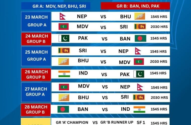 नेपालले आफ्नो उद्घाटन खेलमा भुटानको सामना गर्नेछ । यसैगरी नेपालले दोस्रो खेल मार्च २५ तारिखमा श्रीलङ्कासँग खेल्नेछ भने समूह चरणको अन्तिम खेल २७ मार्चमा माल्दिभ्ससँग हुनेछ ।