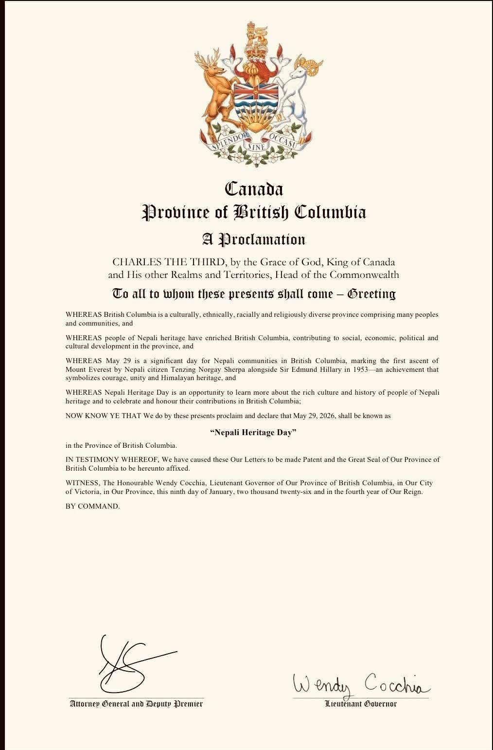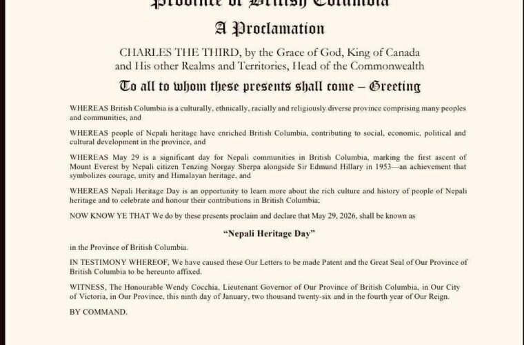 क्यानडाको ब्रिटिश कोलम्बिया प्रान्त सरकारद्वारा मे २९ लाई ‘नेपाल हेरिटेज डे’ को मान्यता