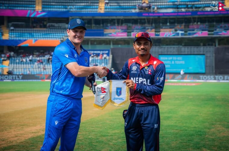 काठमाडौं । आईसीसी टी-२० विश्वकप २०२६ अन्तर्गत केहिबेरमा शुरू हुने खेलमा इटालीले नेपालविरुद्ध टस जितेको छ । मुम्बईस्थित वानखेडे स्टेडियममा केहिबेरमा शुरू हुने खेलमा इटालीले टस जितेर पहिले बलिङ गर्ने निर्णय गरेको हो ।
