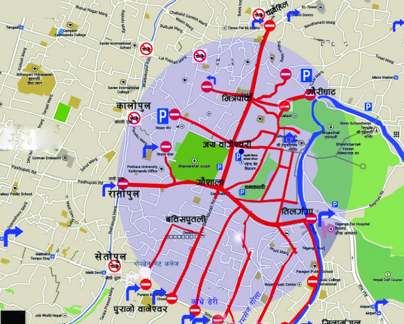 तीनकुनेबाट सिनामङ्गलतर्फ, बौद्ध एरियाबाट गौरीघाटतर्फ, पुरानो बानेश्वर, गौशाला र मित्रपार्कतर्फ आउने सम्पूर्ण मालवाहक सवारी साधनहरुलाई आवश्यकताअनुसार निषेध गरिएको प्रहरी उपरीक्षक सुवेदीले जानकारी दिए । उनका अनुसार वाग्मती करिडोर र जोरपाटीबाट चाबहिल हुँदै आउने सवारीसाधनलाई गुहेश्वरी पारी पार्किङ स्थान तोकिएको छ ।