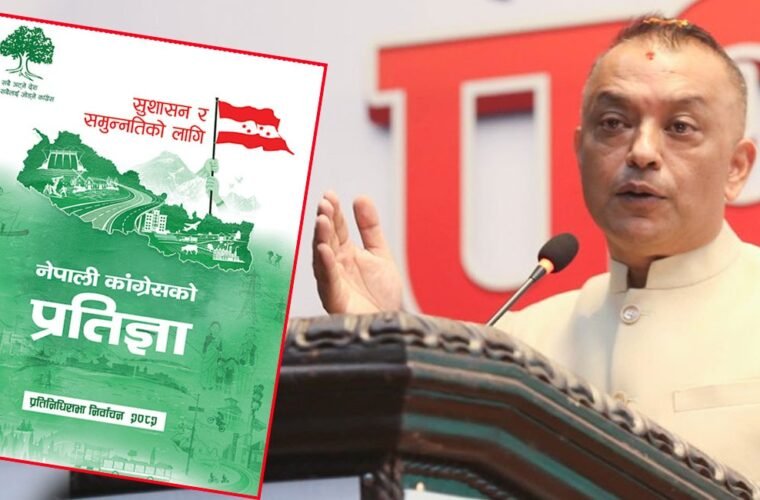 काठमाडौँ । नेपाली कांग्रेसले फागुन २१ गते हुने प्रतिनिधिसभा निर्वाचनका लागि प्रतिज्ञापत्र सार्वजनिक गरेको छ । बिहीबार राष्ट्रियसभा गृहमा आयोजित कार्यक्रममा सभापति गगन थापाले प्रतिज्ञापत्र सार्वजनिक गरेका हुन् ।