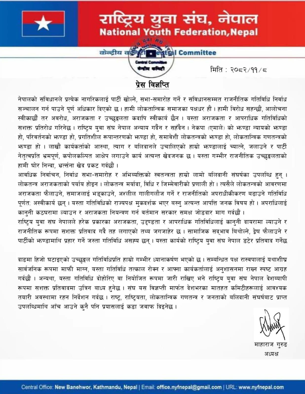 संघका अध्यक्ष महाराज गुरुङले शुक्रबार विज्ञप्ति जारी गरी दाङमा रास्वपा कार्यकर्ताले ‘सूर्य’ अंकित झण्डा जलाएकोमा आपत्ति जनाएका हुन् ।