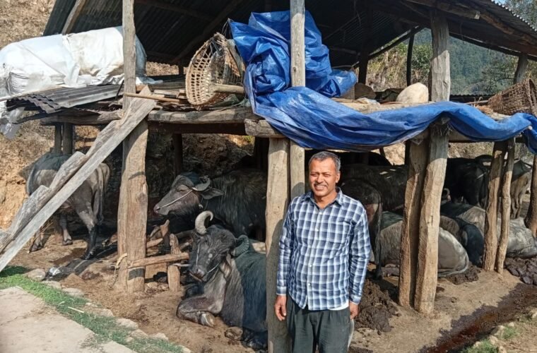 “वरपर जङ्गलको बीचमा पाल टाँगेर मैले यो व्यवसाय सुुुरु गरेको हुँ”, आचार्यले भने, “पछि गोठ तथा धन्सार बनाएर त्यसलाई व्यवस्थित गर्दै लगेँ, अहिले गोठमा ३० भैँसी छन् ।”
