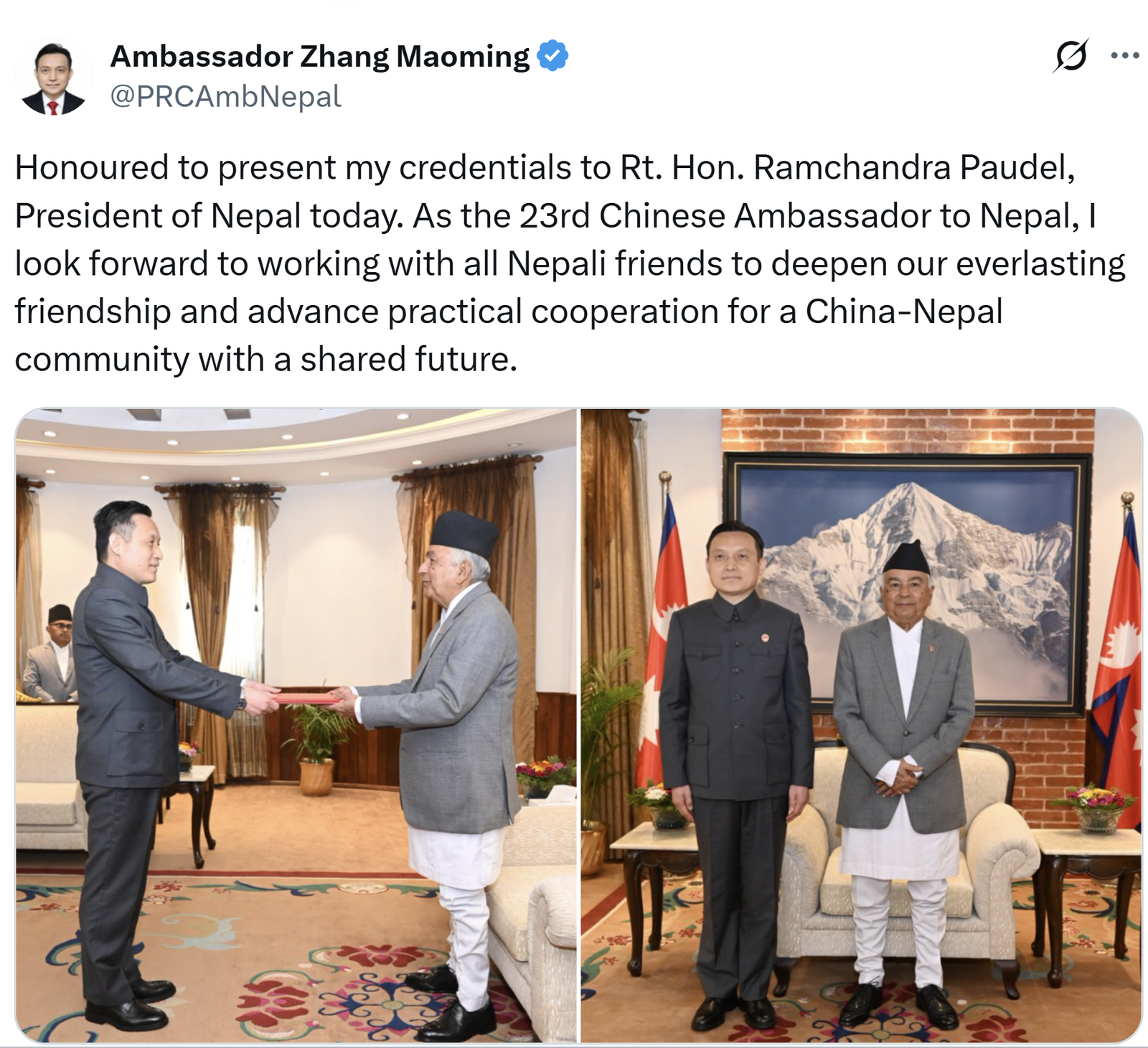 प्रमाणपत्र पेश गरेपछि चिनियाँ राजदूत चाङले सामाजिक सञ्जालमार्फत सम्माननीय राष्ट्रपति रामचन्द्र पाैडेलसमक्ष ओहोदाको प्रमाणपत्र पेश गर्न पाएकोमा गौरवान्वित भएकाे बताएका छन् ।