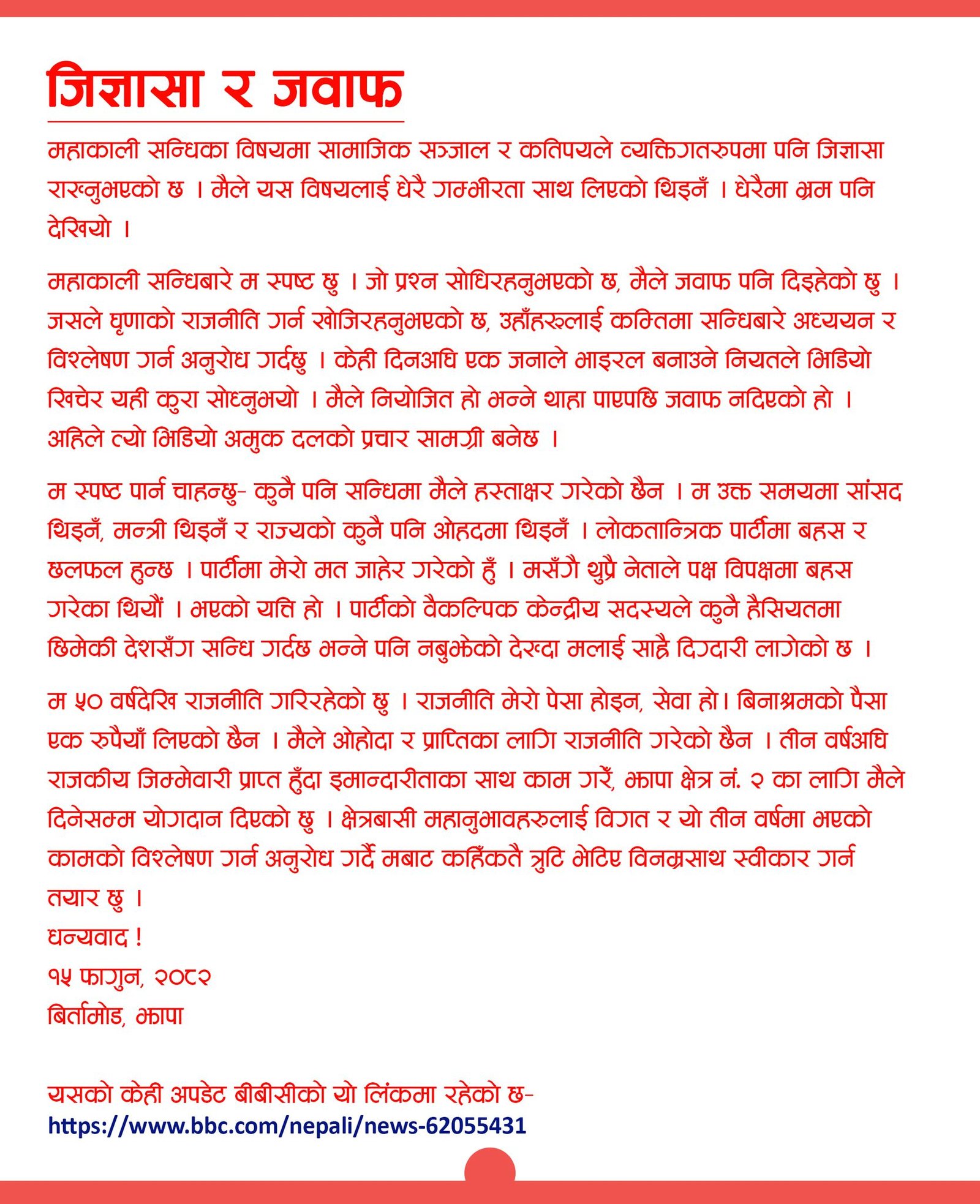 उनले आफू ५० वर्षदेखि राजनीतिमा रहेको र ओहोदा र प्राप्तिका लागि राजनीति नगरेको उल्लेख गरेका छन् । उनले भनेका छन्, ‘म ५० वर्षदेखि राजनीति गरिरहेको छु । राजनीति मेरो पेसा होइन, सेवा हो । बिनाश्रमको पैसा एक रुपैयाँ लिएको छैन । मैले ओहोदा र प्राप्तिका लागि राजनीति गरेको छैन । तीन वर्षअघि राजकीय जिम्मेवारी प्राप्त हुँदा इमान्दारीताका साथ काम गरेँ, झापा क्षेत्र नं. २ का लागि मैले दिनेसम्म योगदान दिएको छु । क्षेत्रबासी महानुभावहरुलाई विगत र यो तीन वर्षमा भएको कामको विश्लेषण गर्न अनुरोध गर्दै मबाट कहिँकतै त्रुटि भेटिए विनम्रसाथ स्वीकार गर्न तयार छु ।’