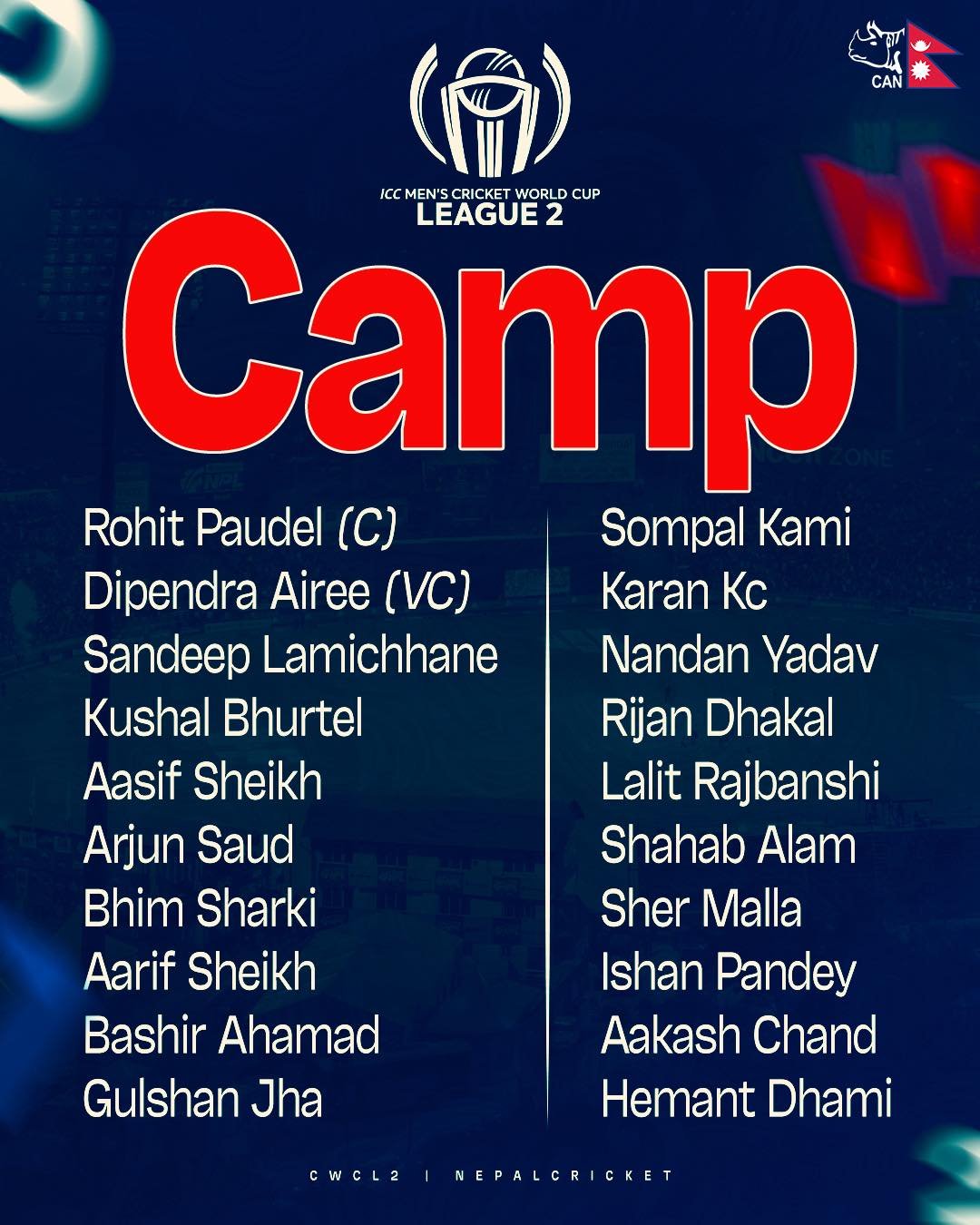 बन्द प्रशिक्षणमा बोलाइएका खेलाडीमा रोहित पौडेल(कप्तान) दीपेन्द्र सिंह एरी(उपकप्तान), सन्दीप लामिछाने, कुशल भुर्तेल, आसिफ शेख, अर्जुन साउद, भीम शार्की, आरिफ शेख, बासिर अहमद, गुलशन झा, सोमपाल कामी, करण केसी, नन्दन यादव, रिजन ढकाल, ललित राजवंशी, शाहाब आलम, शेर मल्ल, इशान पाण्डे, आकाश चन्द र हेमन्त धामी रहेका छन् ।