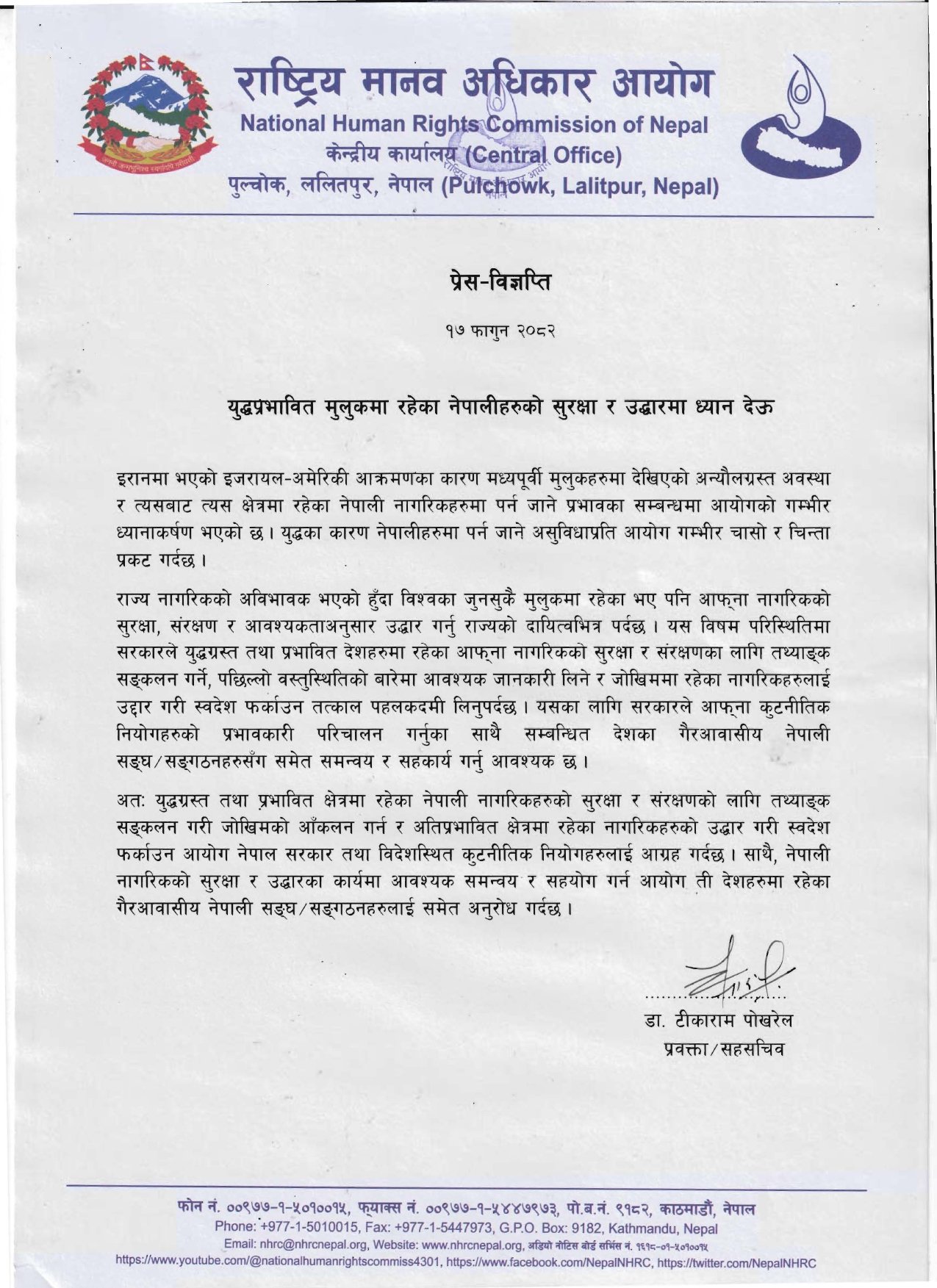 आइतबार आयोगका प्रवक्ता डा. टीकाराम पोखरेलले विज्ञप्ति जारी गरी युद्धका कारण नेपालीहरुमा पर्न जाने असुविधाप्रति चासो लिएका हुन् । आयोगले यस्तो विषम परिस्थितिमा सरकारले युद्धग्रस्त तथा प्रभावित देशहरुमा रहेका आफ्ना नागरिकको सुरक्षा र संरक्षणका लागि तथ्याङ्क सङ्कलन गर्ने, पछिल्लो वस्तुस्थितिको बारेमा आवश्यक जानकारी लिनुपर्ने उल्लेख गरेका छन्।