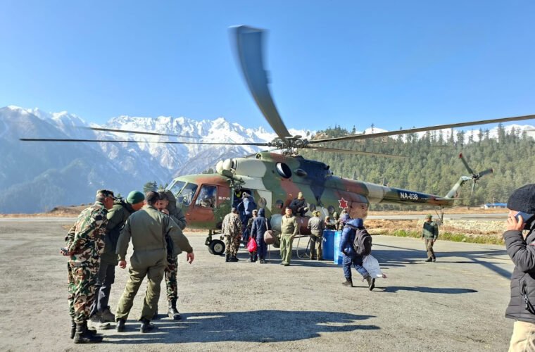 सिमकोट (हुम्ला) । हुम्लाको उत्तरी नाम्खा गाउँपालिका–४ को चाला र वडा नं–६ लिमीका तीन मतदान केन्द्रका कर्मचारी र सुरक्षाकर्मी तथा निर्वाचन सामग्री नेपाली सेनाको हेलिकप्टरमा ढुवानी भइरहेको छ ।