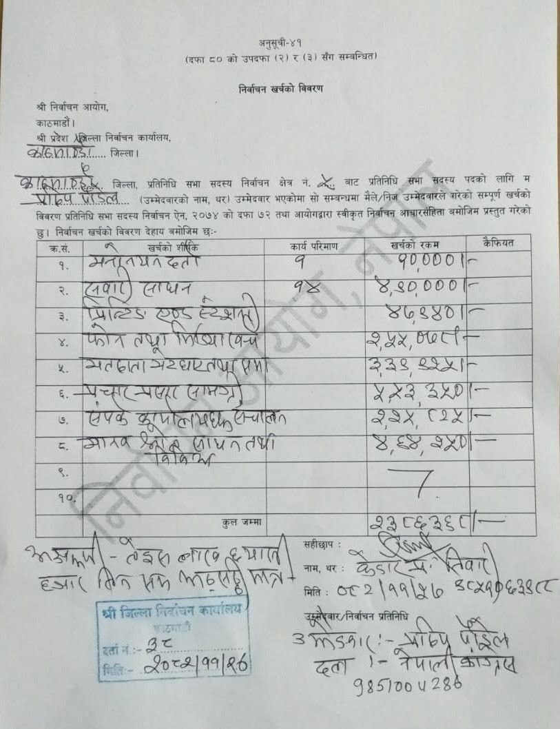 कांग्रेस महामन्त्री पौडेलको चुनावी खर्च २३ लाख ८६ हजार ३६८ रूपैयाँ