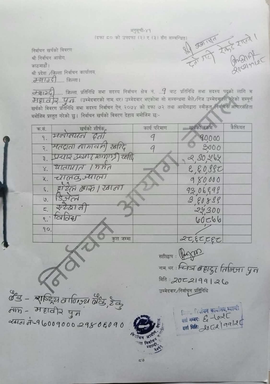 काठमाडौँ । नवनिर्वाचित स्वतन्त्र सांसद महावीर पुनले आफ्नो निर्वाचन खर्चको विवरण सार्वजनिक गरेका छन् । म्याग्दी क्षेत्र नम्बर १ बाट निर्वाचित पुनले २८ लाख ६८ हजार ८६८ रुपैयाँ खर्च भएको जानकारी गराएका छन् ।