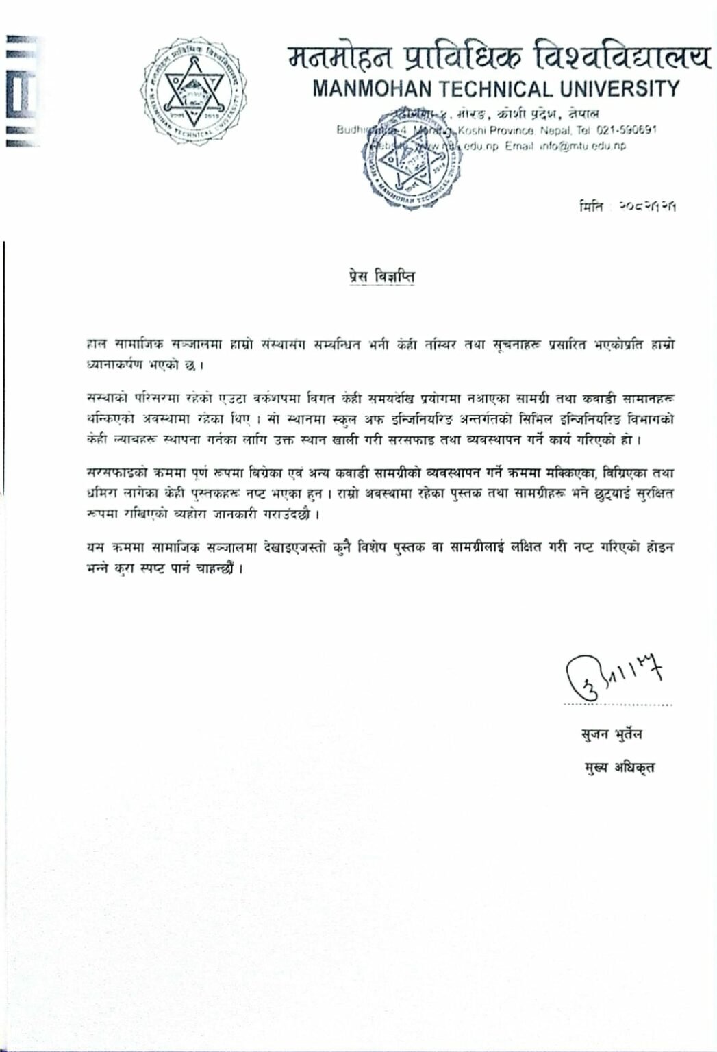 विश्वविद्यालयले संस्थाको परिसरमा रहेको एउटा वर्कशपमा विगत केही समयदेखि प्रयोगमा नआएका सामग्री तथा कवाडी सामानहरू थन्किएको अवस्थामा रहेका र तिनै समान जनाएको बताएको छ ।