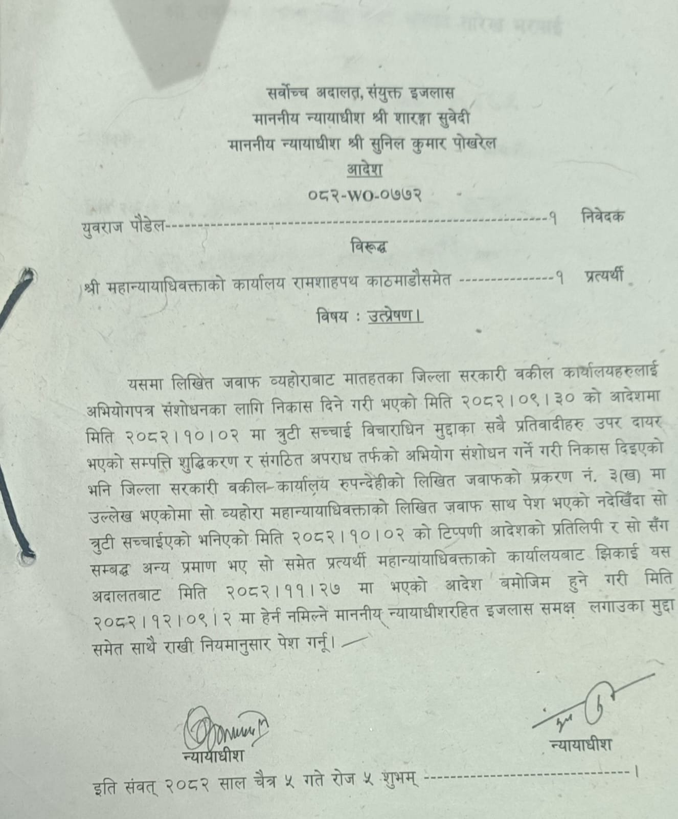 बिहीबार सर्वोच्चका न्यायाधीश सारंगा सुवेदी र सुनिलकुमार पोखरलेको इजलासले अभियोग पत्र संशोधनका लागि दिइएको निर्देशन र सोसँग सम्बन्धित कागजातहरू महान्यायाधिवक्ताको कार्यालयबाट झिकाउन आदेश दिएको हो ।