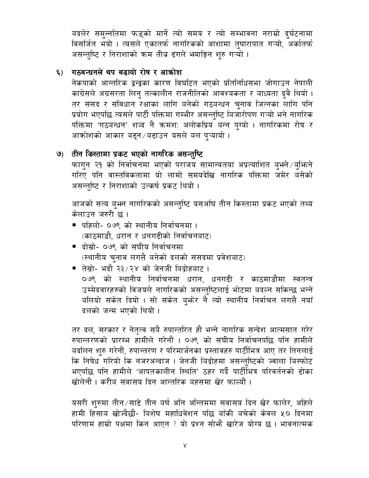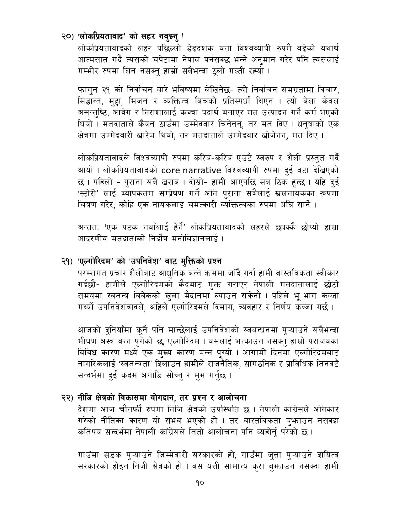 काठमाडौँ । नेपाली कांग्रेसले चुनावी हारको प्रारम्भिक समीक्षा गरेको छ । शुक्रबारको केन्द्रीय कार्यसमिति बैठकमा उपसभापति विश्वप्रकाश शर्माले १४ पृष्ठको प्रारम्भिक समीक्षा प्रतिवेदन प्रस्तुत गरेका हुन् । प्रतिवेदनमा निर्वाचन परिणाम र पराजयका कारणबारे विश्लेषण गरिएको छ ।