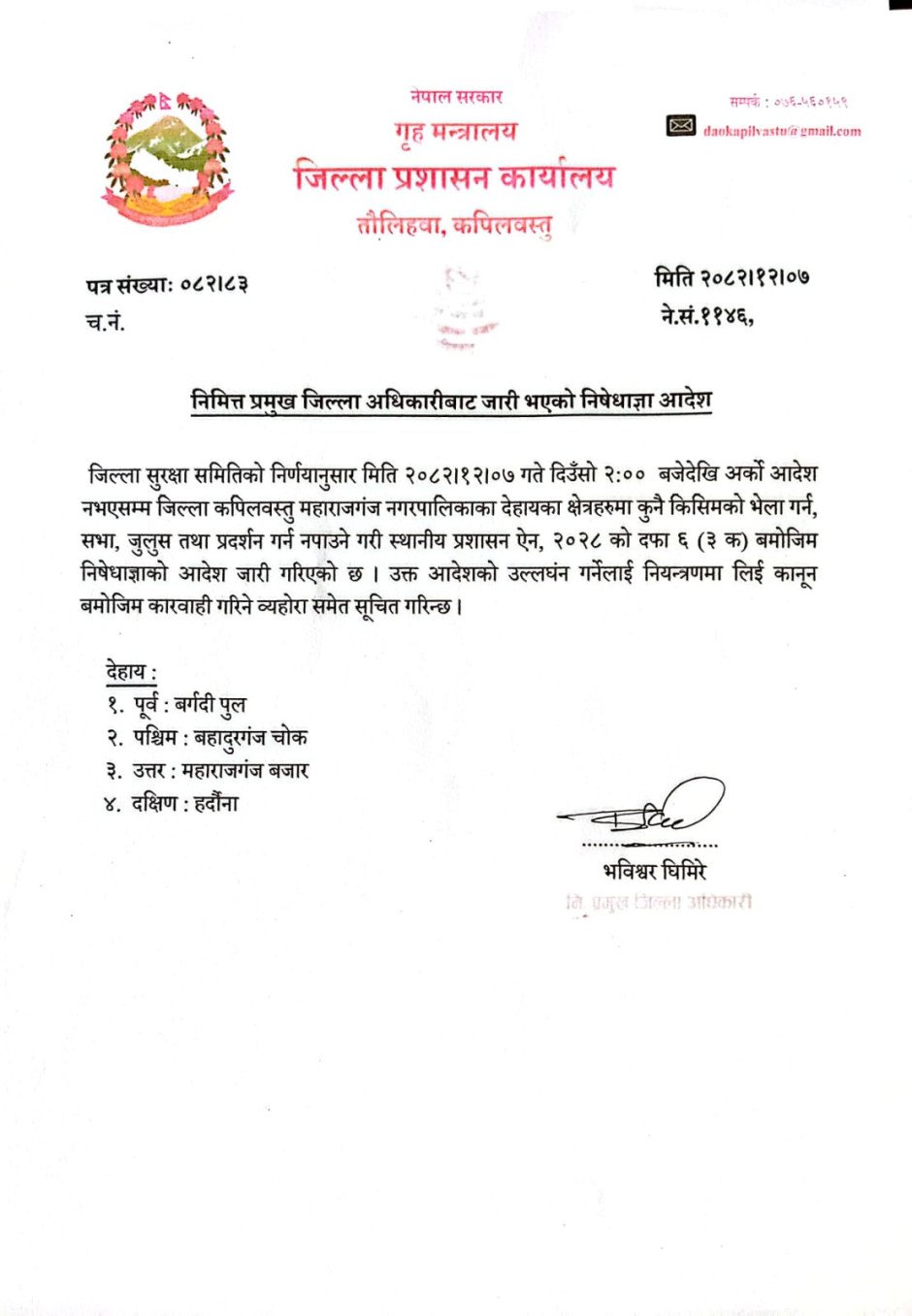 सम्भावित झडपलाई रोक्न कुनै किसिमको भेला, सभा, जुलुस गर्न नपाउने गरी जिल्ला प्रशासन कार्यालय कपिलवस्तुले आज दिउँसो २ बजेदेखि अर्को सूचना जारी नभएसम्म निषेधाज्ञा जारी गरेको छ ।