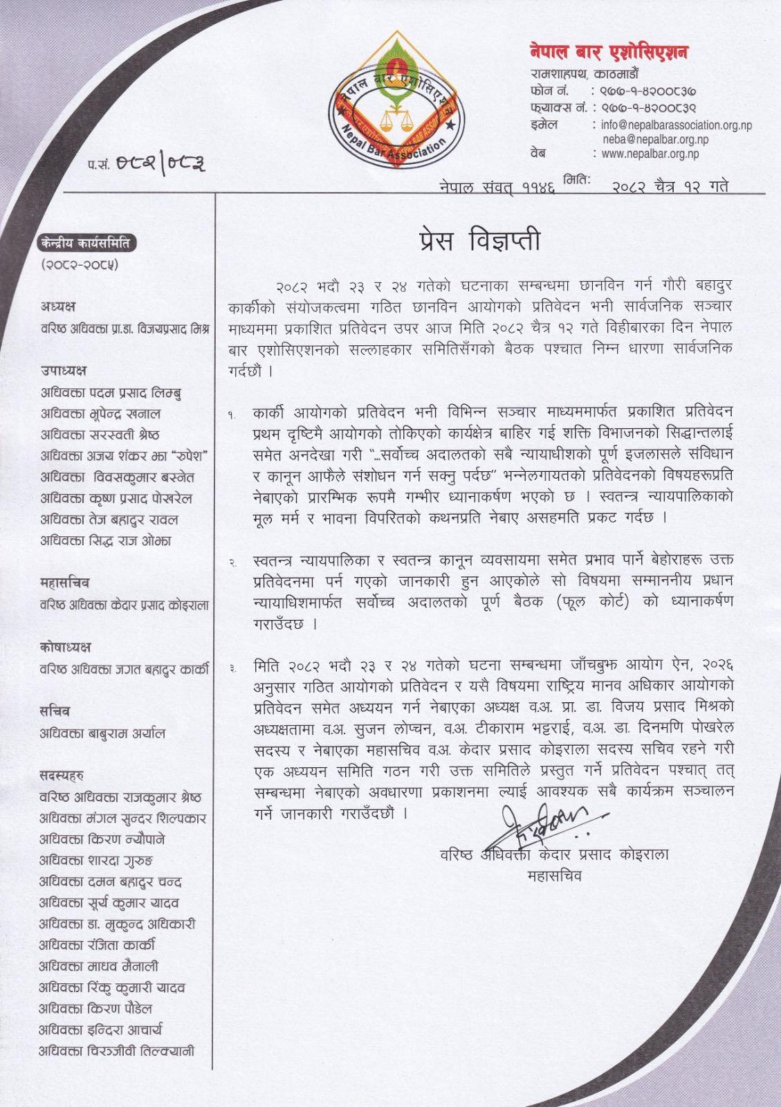 नेपाल बार एसोसिएसनद्वारा कार्की आयोगको प्रतिवेदन अध्ययन गर्न समिति गठन