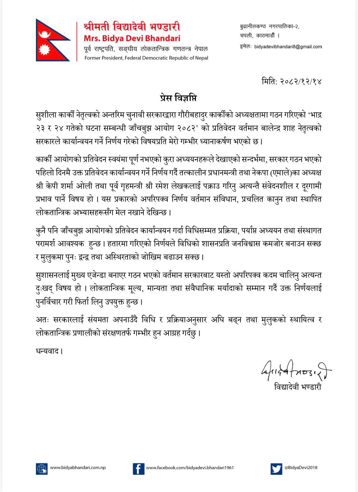 शनिबार विज्ञप्ति जारी गरी पूर्व राष्ट्रपति भण्डारीले यो पक्राउले दूरगामी प्रभाव पार्ने र अस्थिरताको जोखिम बढाउनसक्ने बताएकी हुन् । उनले यस प्रकारको अपरिपक्व निर्णय वर्तमान संविधान, प्रचलित कानुन तथा स्थापित लोकतान्त्रिक अभ्यासहरूसँग मेल नखाने उल्लेख गरेकी छन् ।