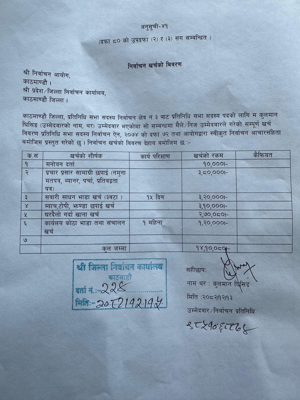 कुलमानको चुनावी खर्च १४ लाख १० हजार